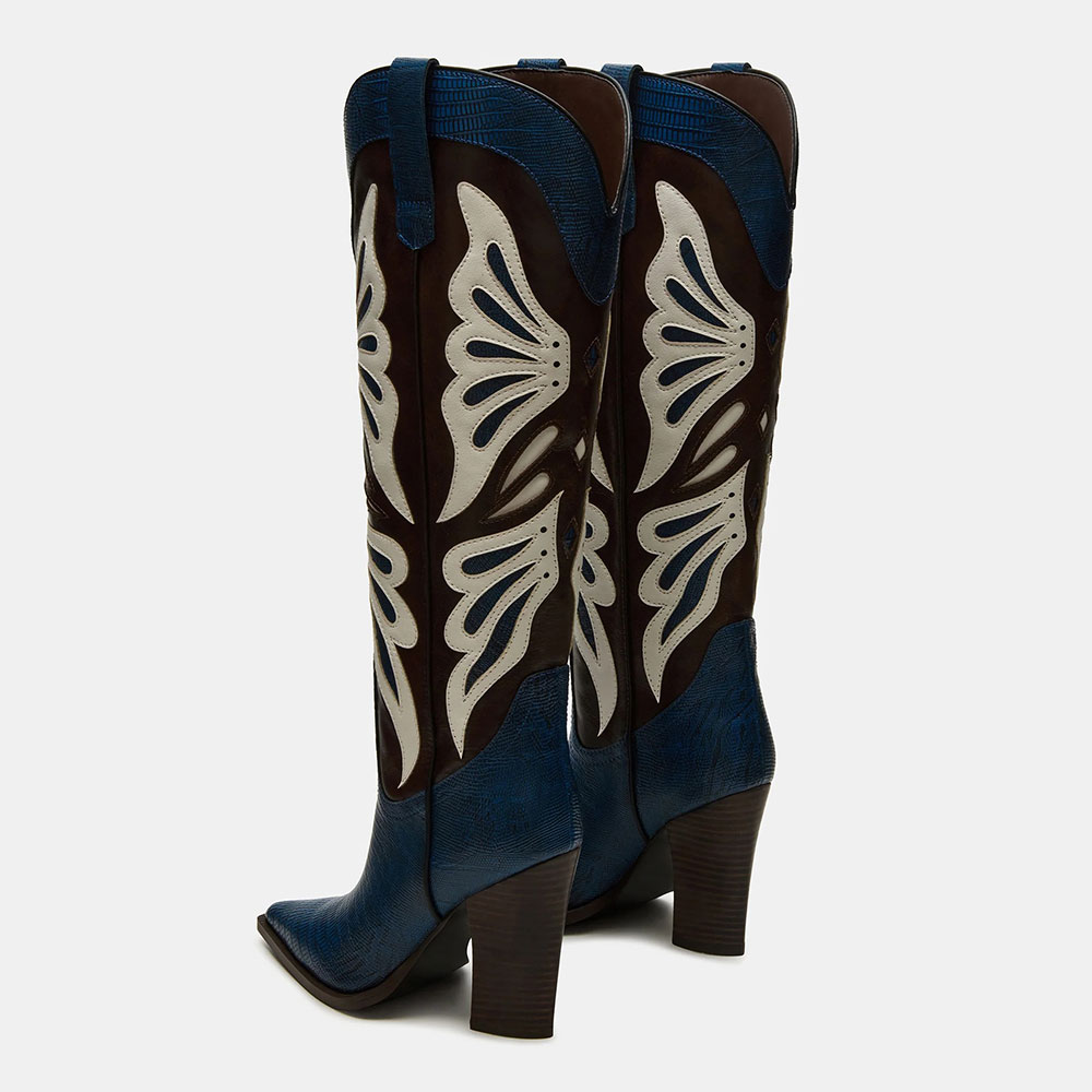 Blue Chunky Heel Butterfly Inlay Pointed Toe Western Boots for Women