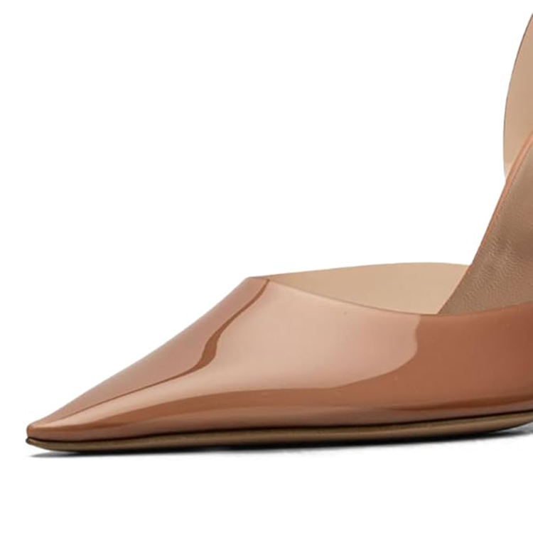 Special Designs: Brown pumps feature a slingback strap design and a transparent heel.