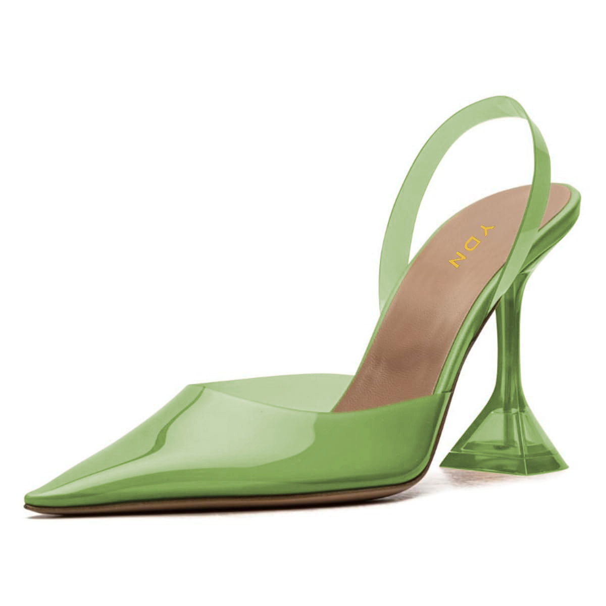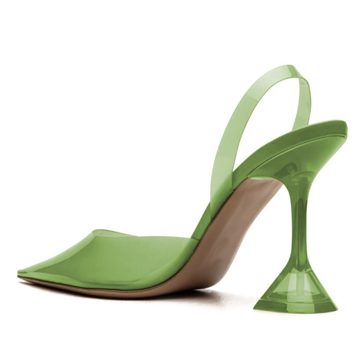 Green Transparent Pointed Toe Flared Heel Pumps Shoes with Slingback