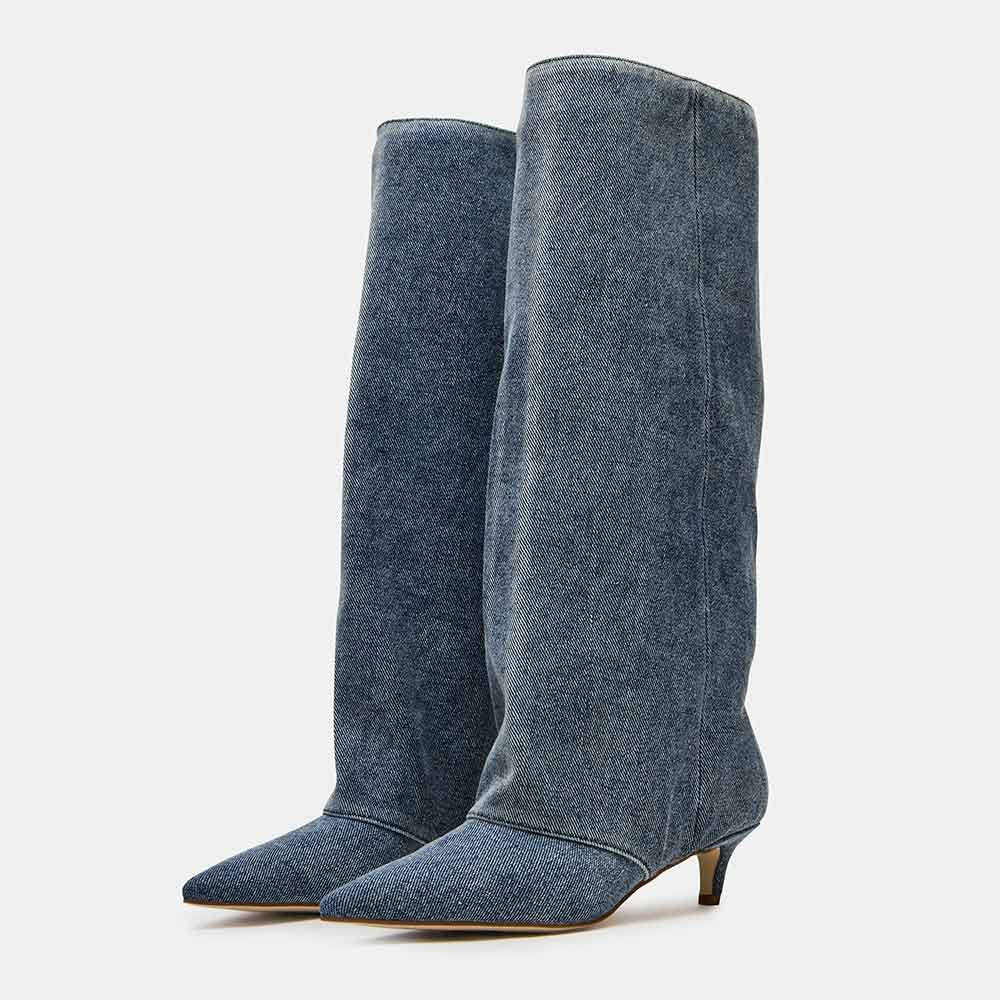 Stylish Denim Pointed Toe Pull On Knee High Heeled Boots in Blue