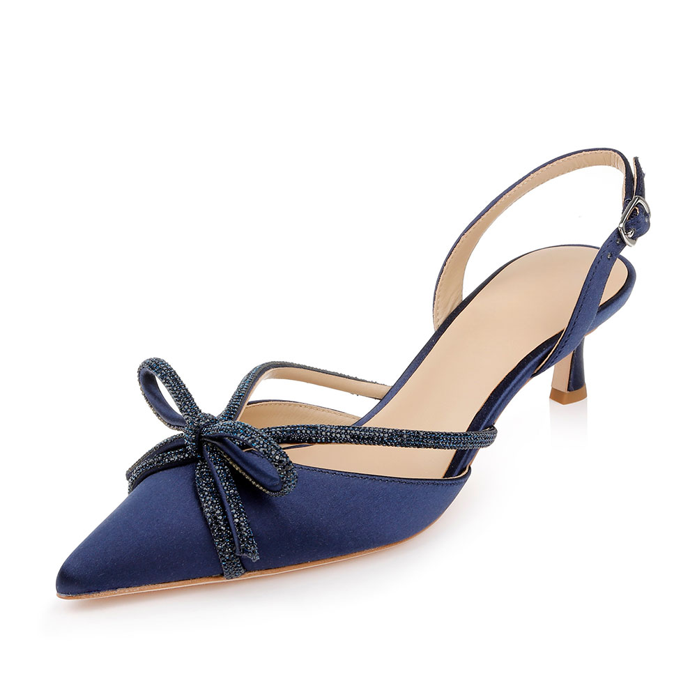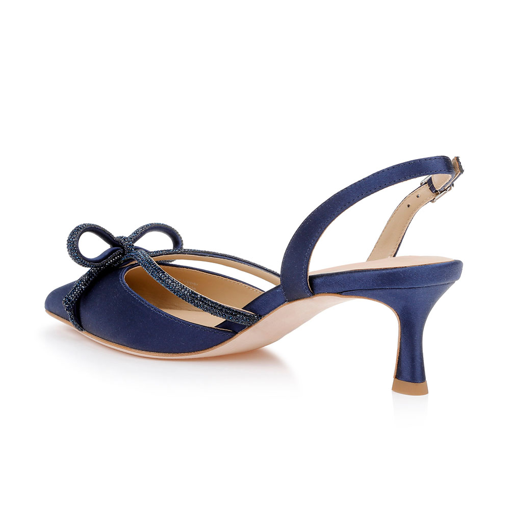 YDN Navy Satin Kitten Heel Rhinestone Bow Slingback Pumps