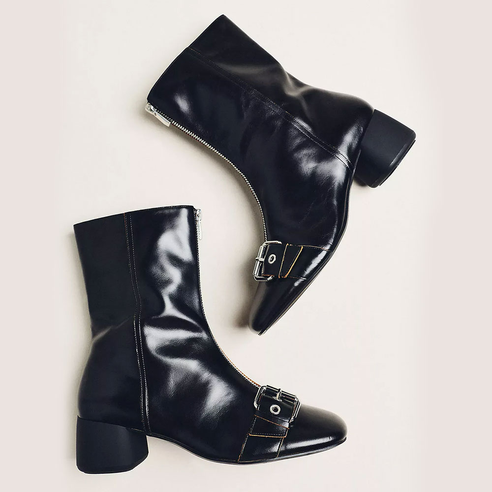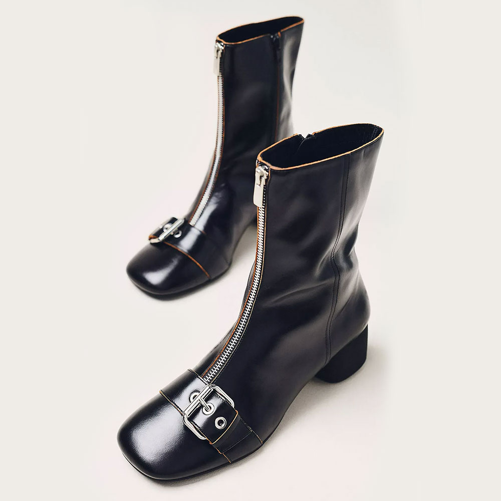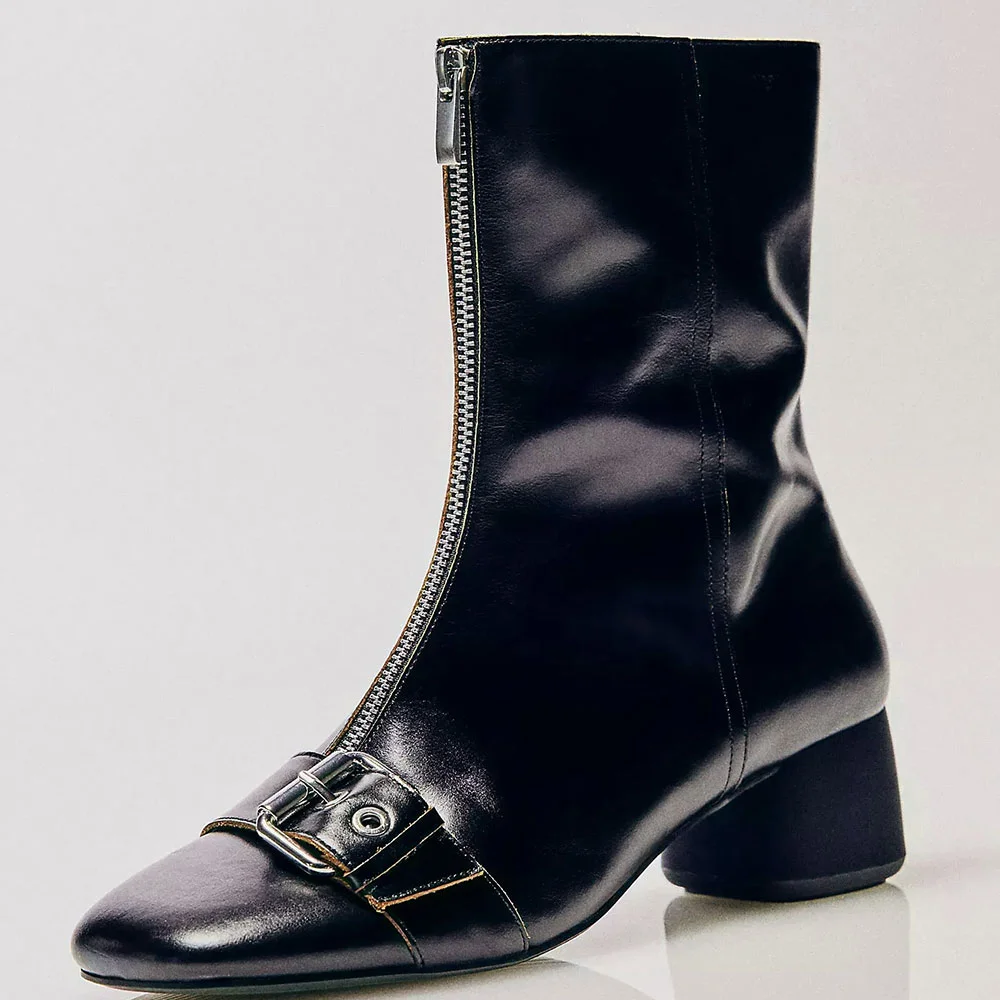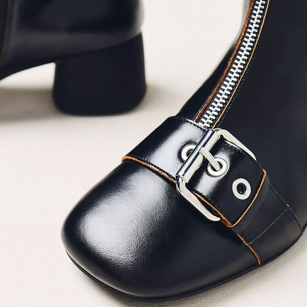 Black Square Toe Buckled Front Zipper Ankle Boots for Women