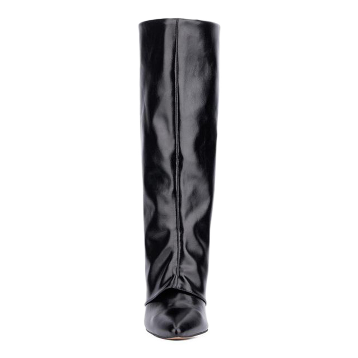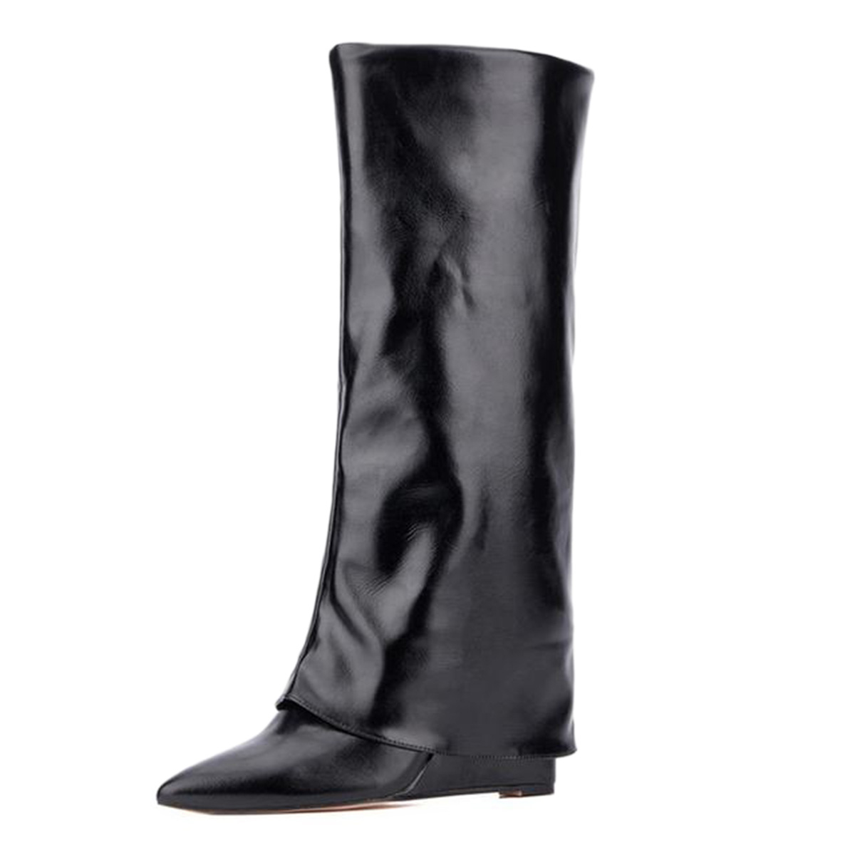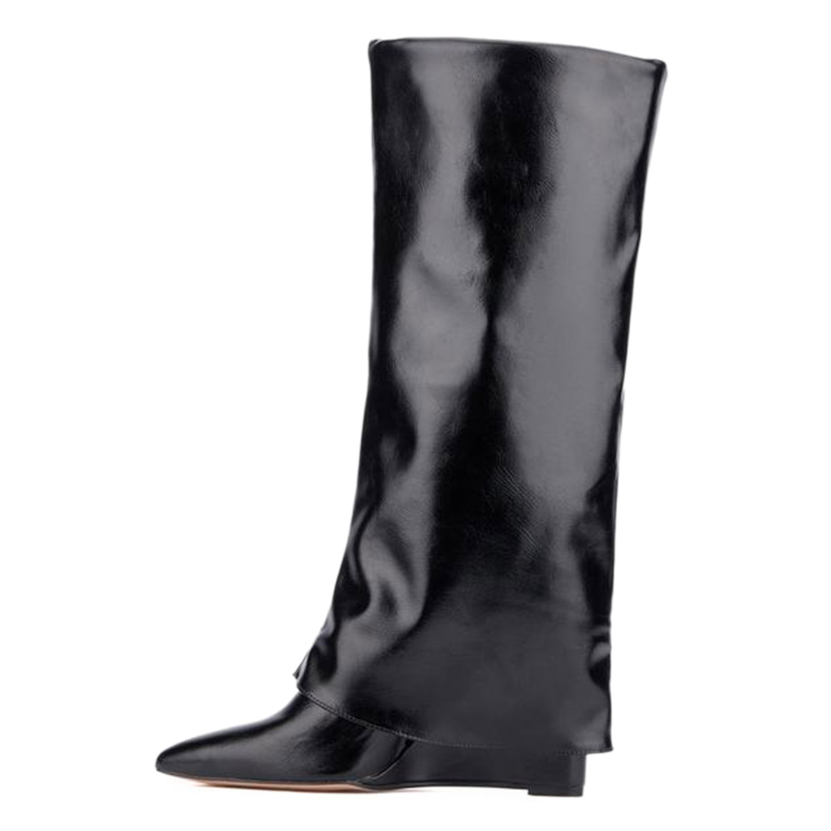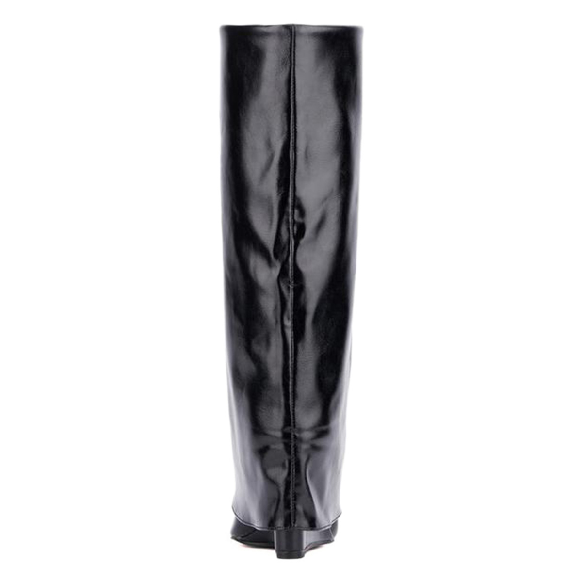 Ladies Vegan Leather Pointed Fold-Over Wedge Heel Boots in Black