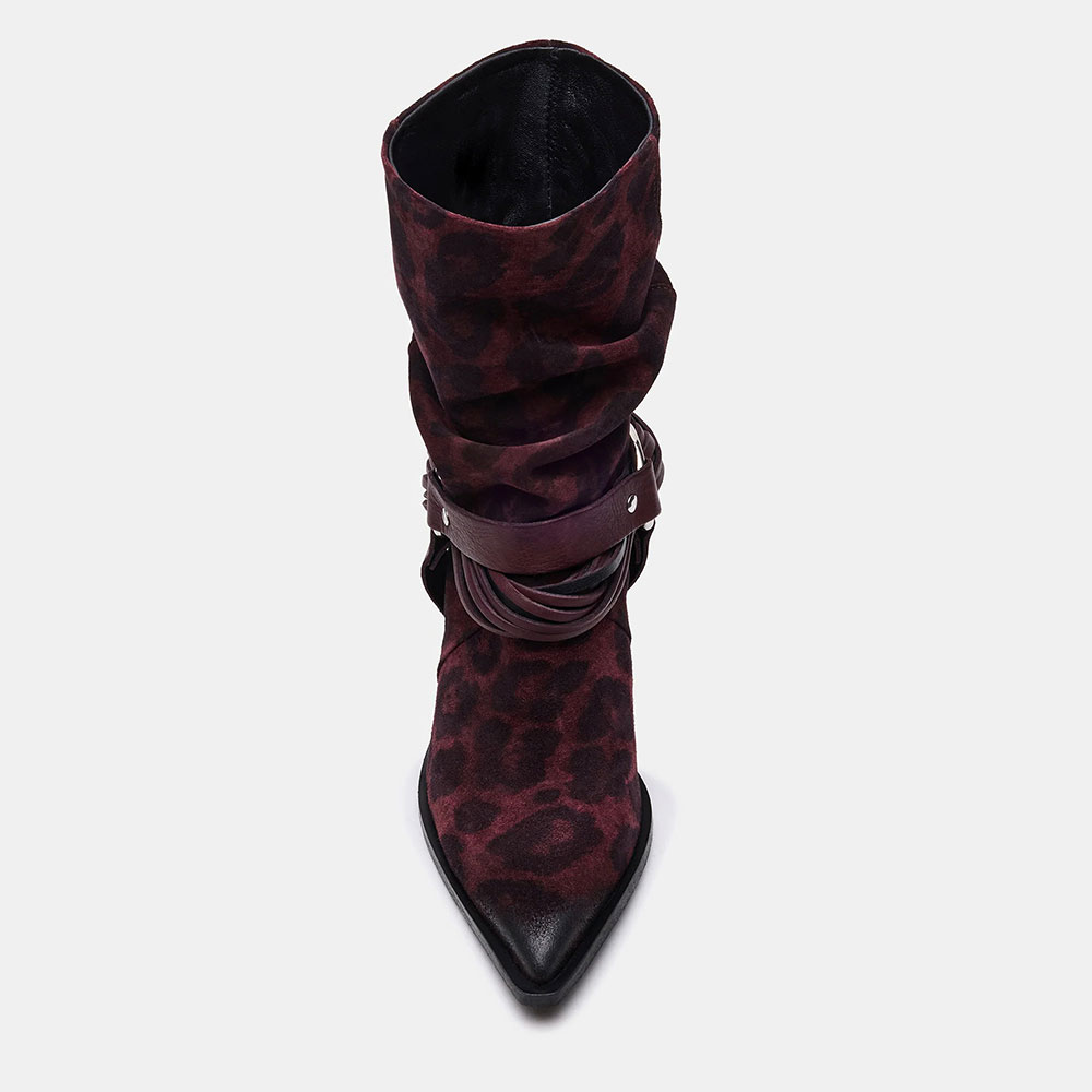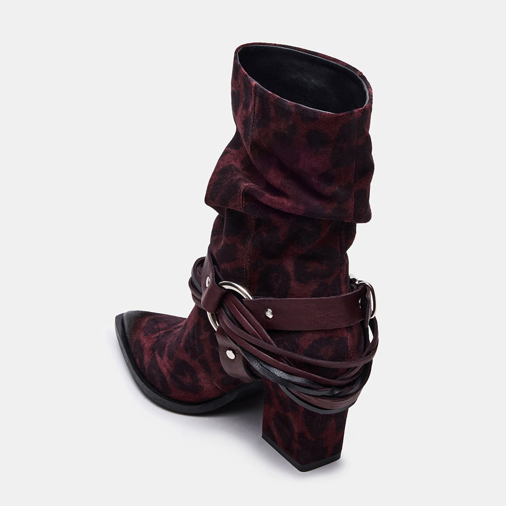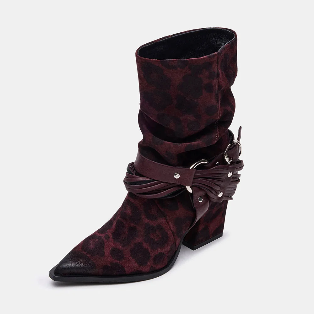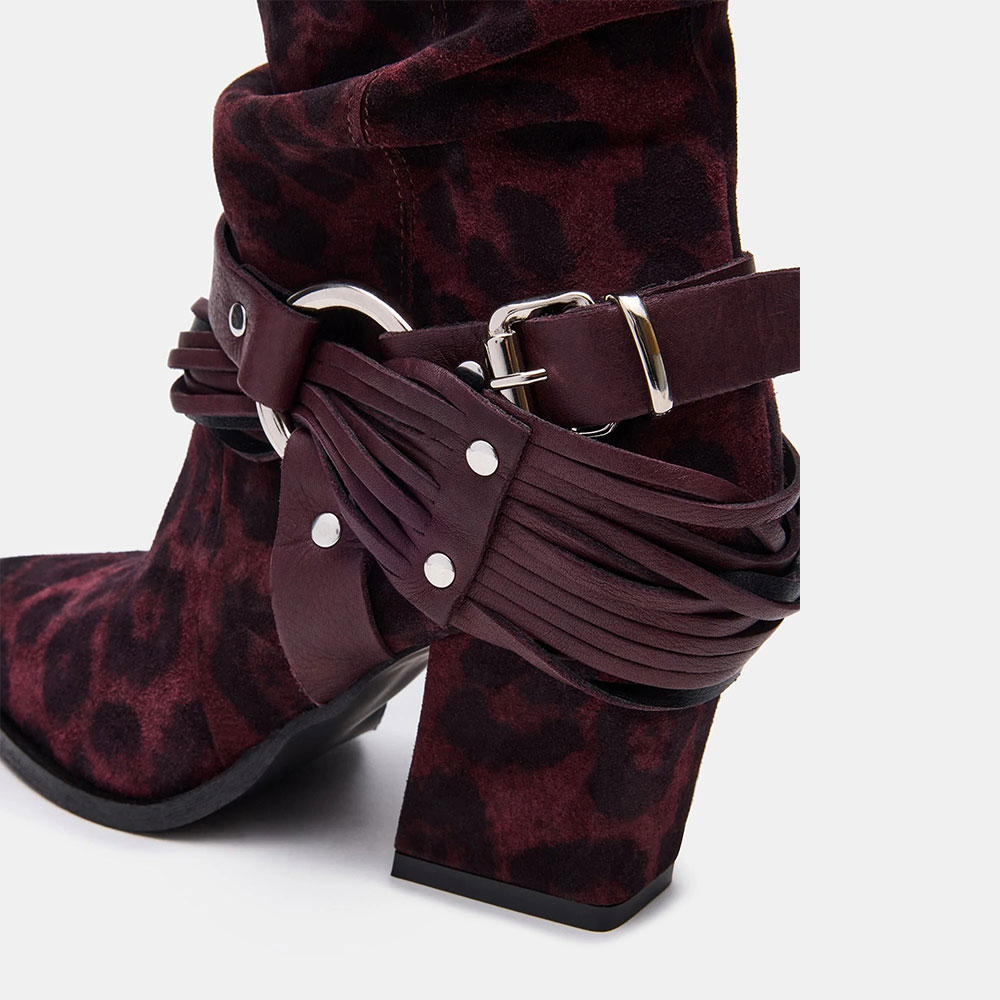 Maroon Vegan Suede Pointed Toe Buckle Leopard Print Heeled Booties