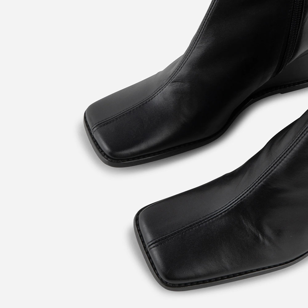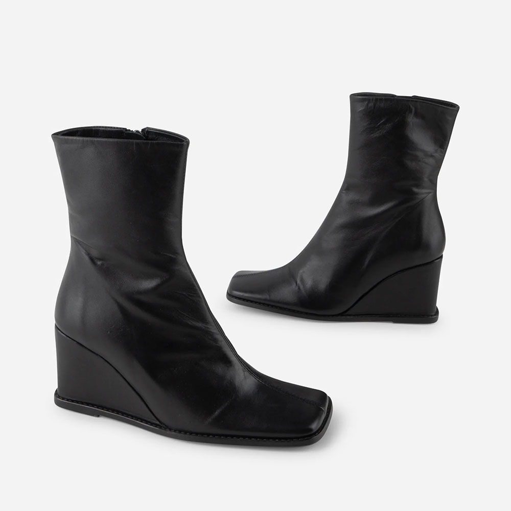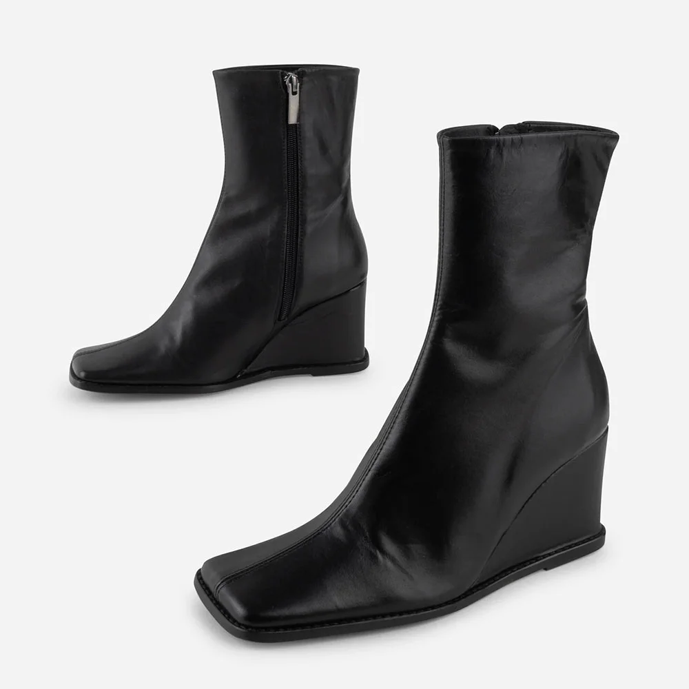 Short Elegant Black Square Toe Zipper Wedge Heel Booties for Women