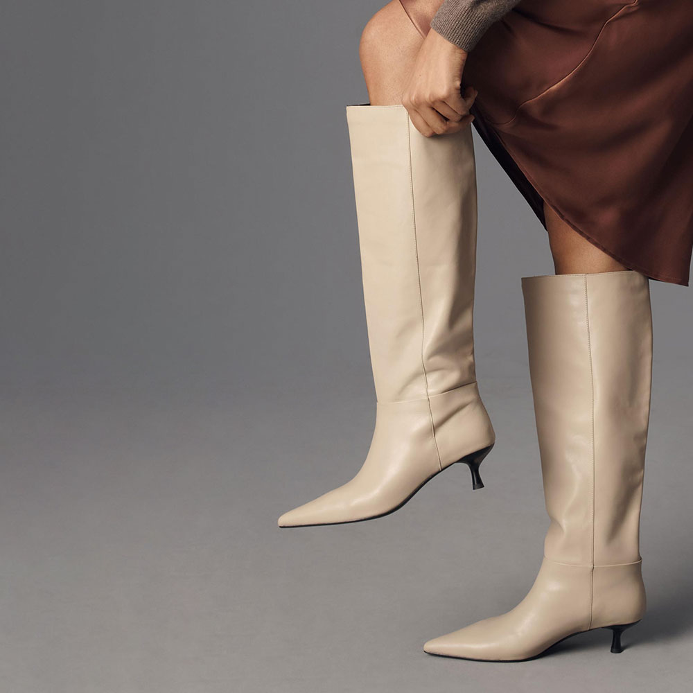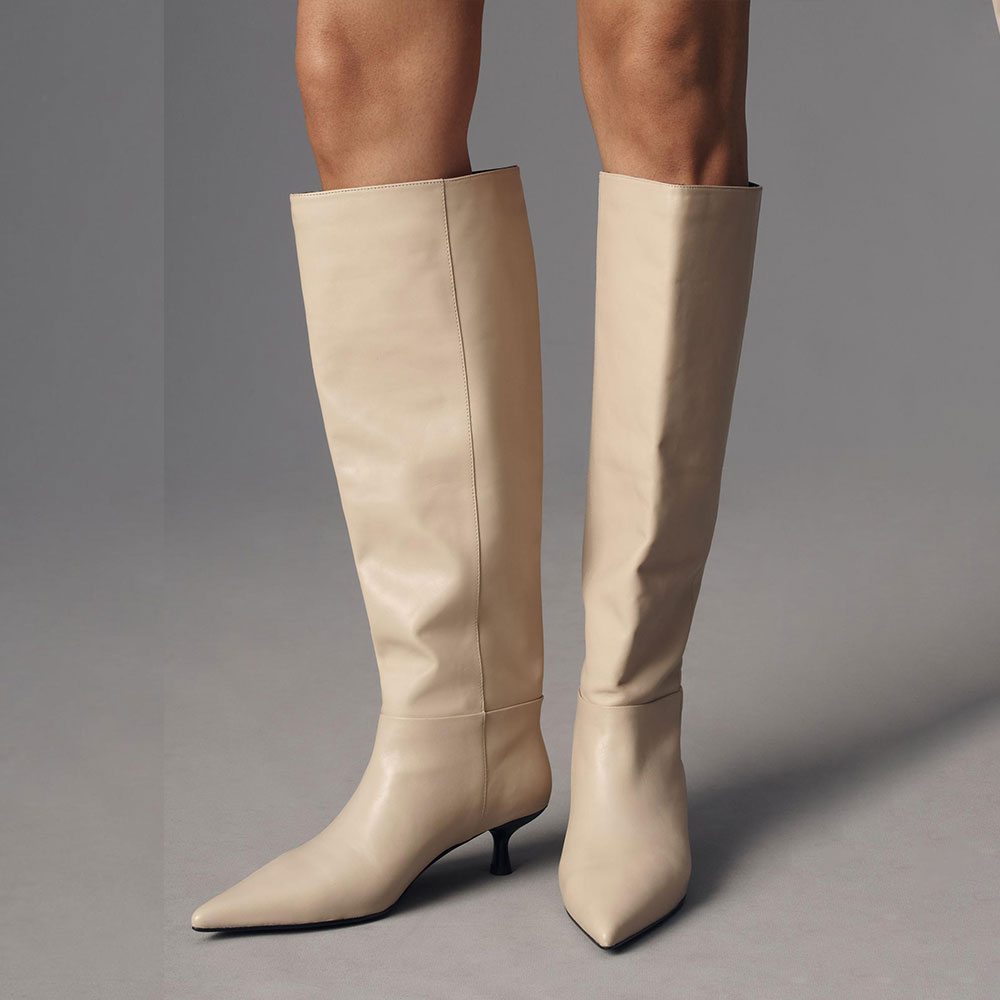Special Designs: The beige pointed-toe knee-high boots feature classy kitten heels and a pull-on design.
