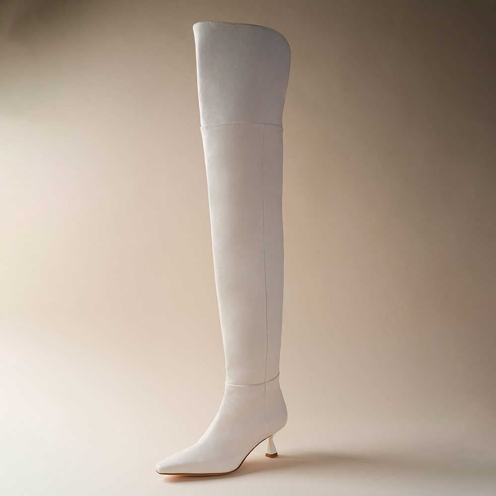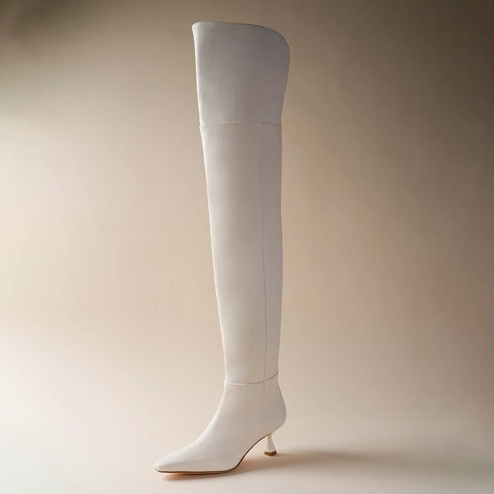 Women's Ivory Pointed Toe Kitten Heel Zipper Thigh High Boots