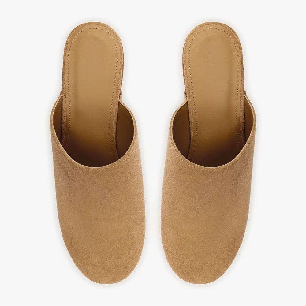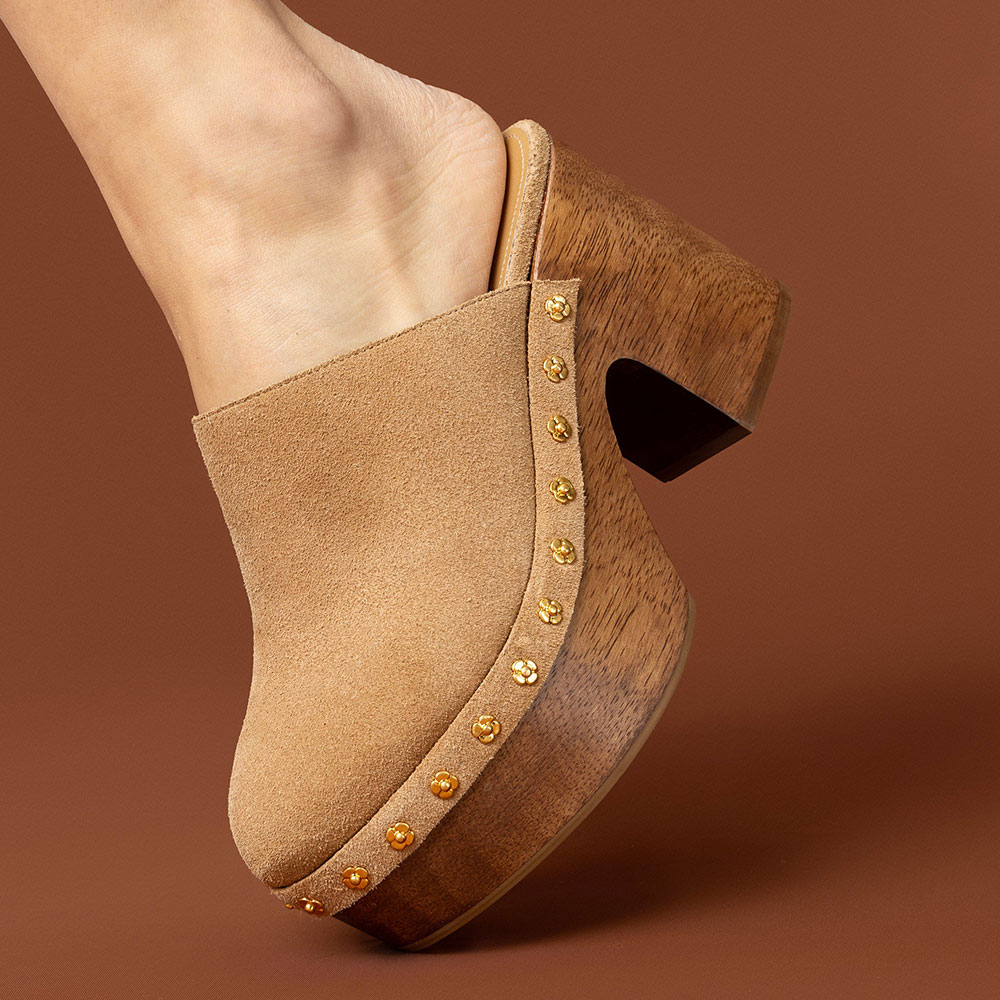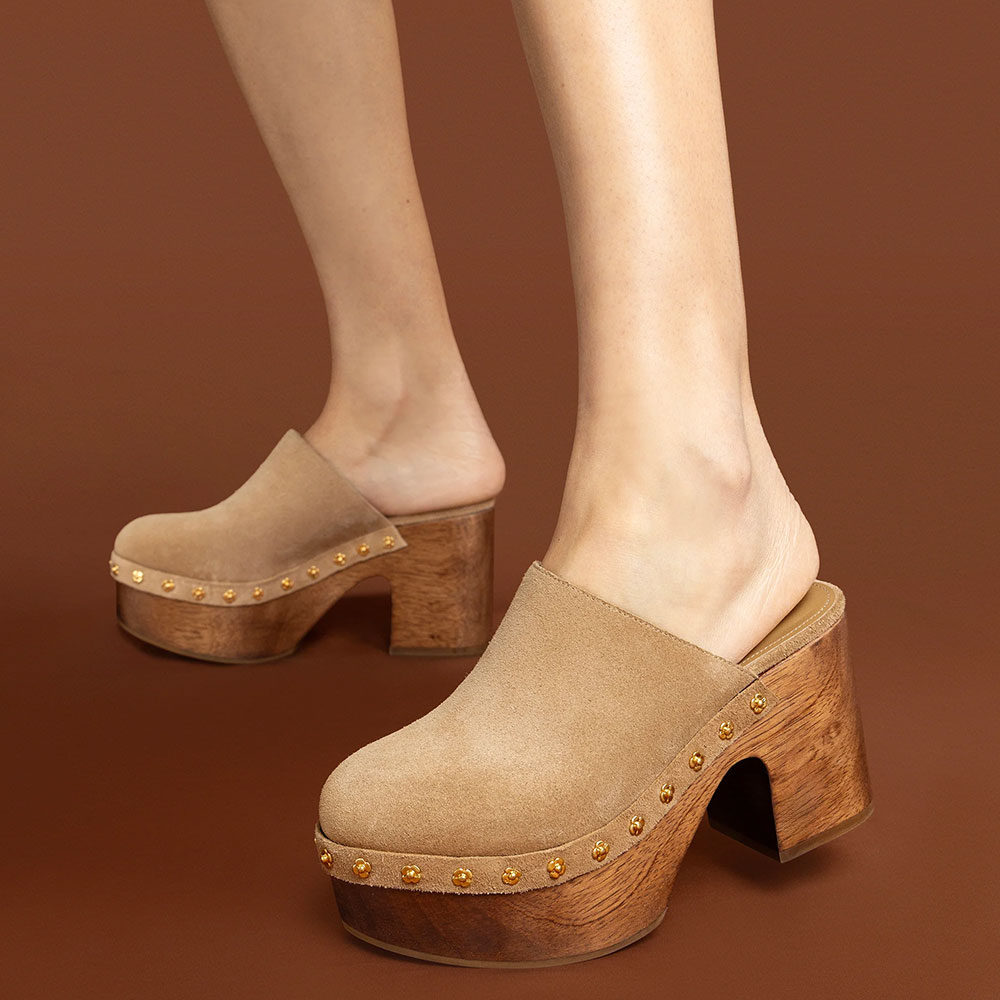 Vegan Suede Closed Round Toe Platform Studded Heeld Mules in Tan