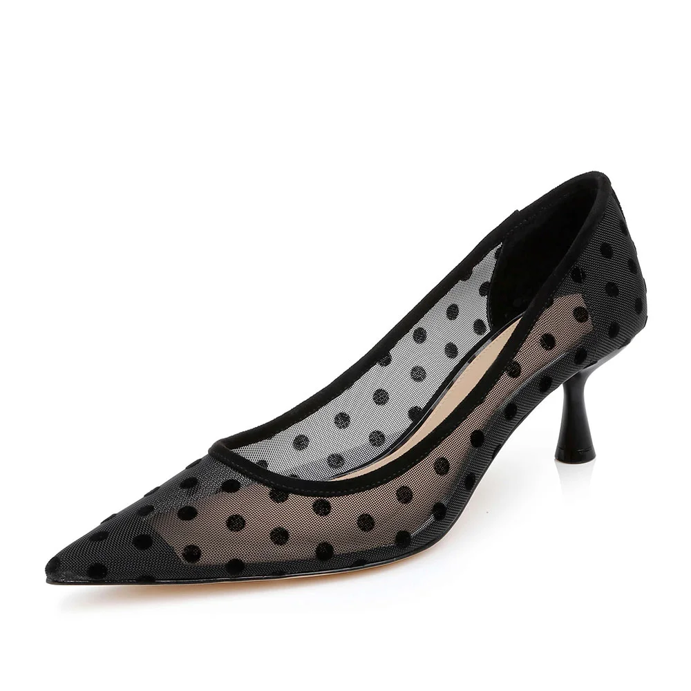 Black Mesh Polka Dot Pointed Toe Mid Spool Heel Pumps for Women