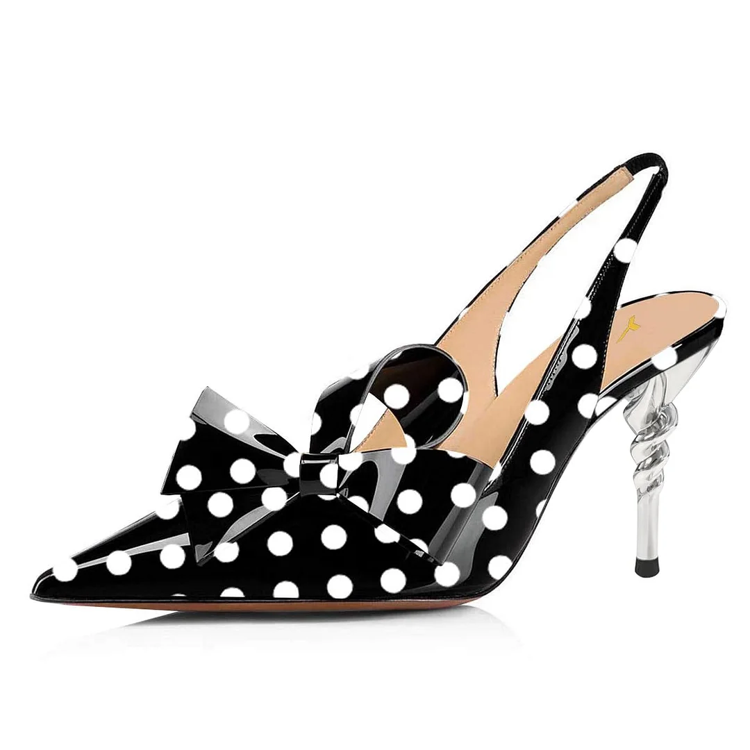 Black Pointed Toe White Polka Dots Slingback Heels with Bow