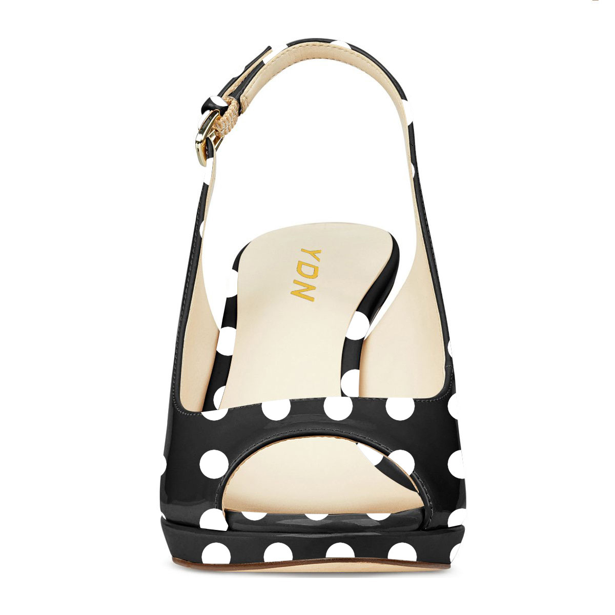 Special Designs: Black and white polka dot sandals featuring a buckle fastening slingback strappy design and a bold platform