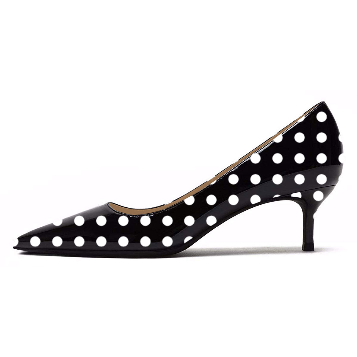 Special Designs: The pointed-toe black pumps feature a chic white polka dot and an elegant kitten heel.