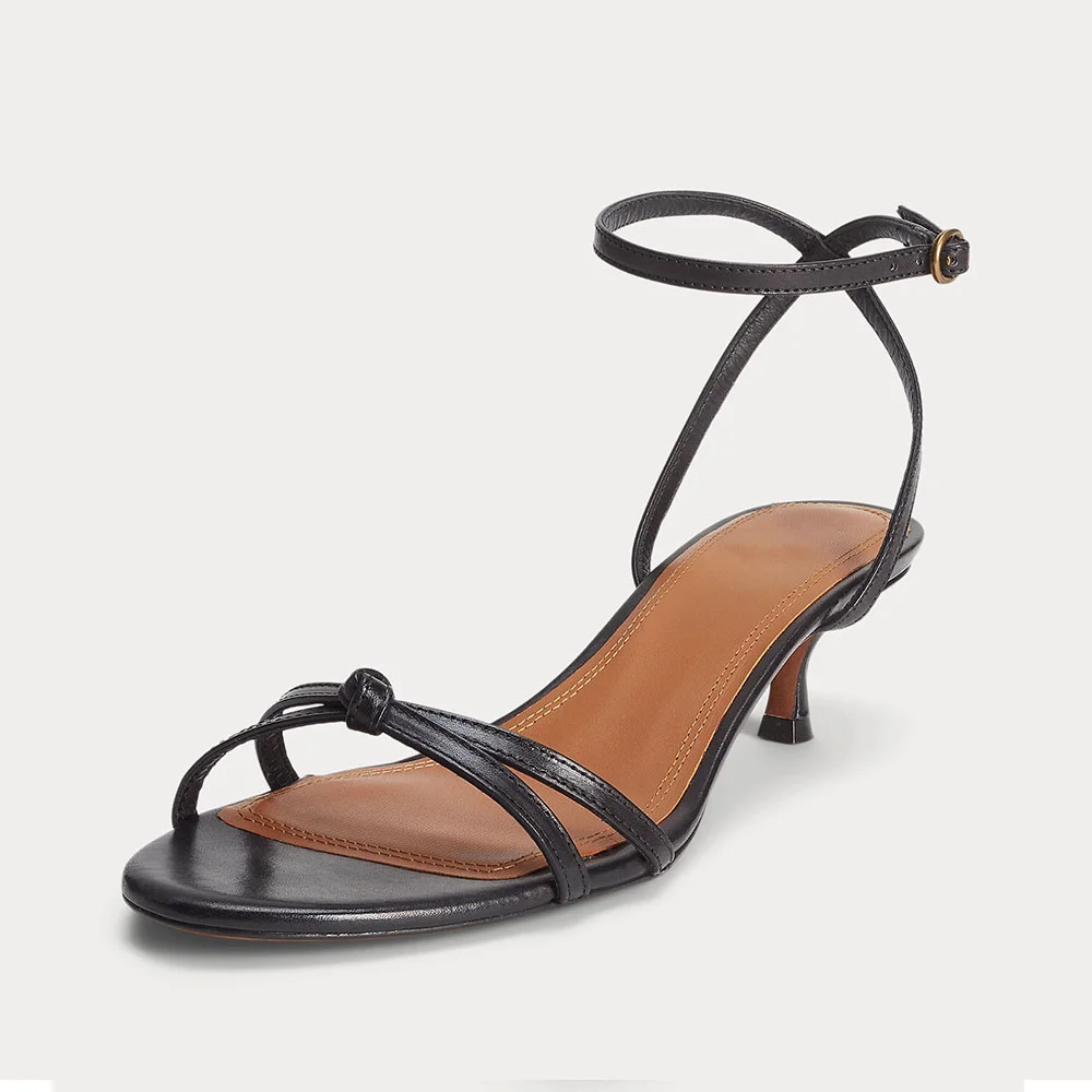 Open Toe Kitten Heel Cross Ankle Strap Knot Black Sandals for Women