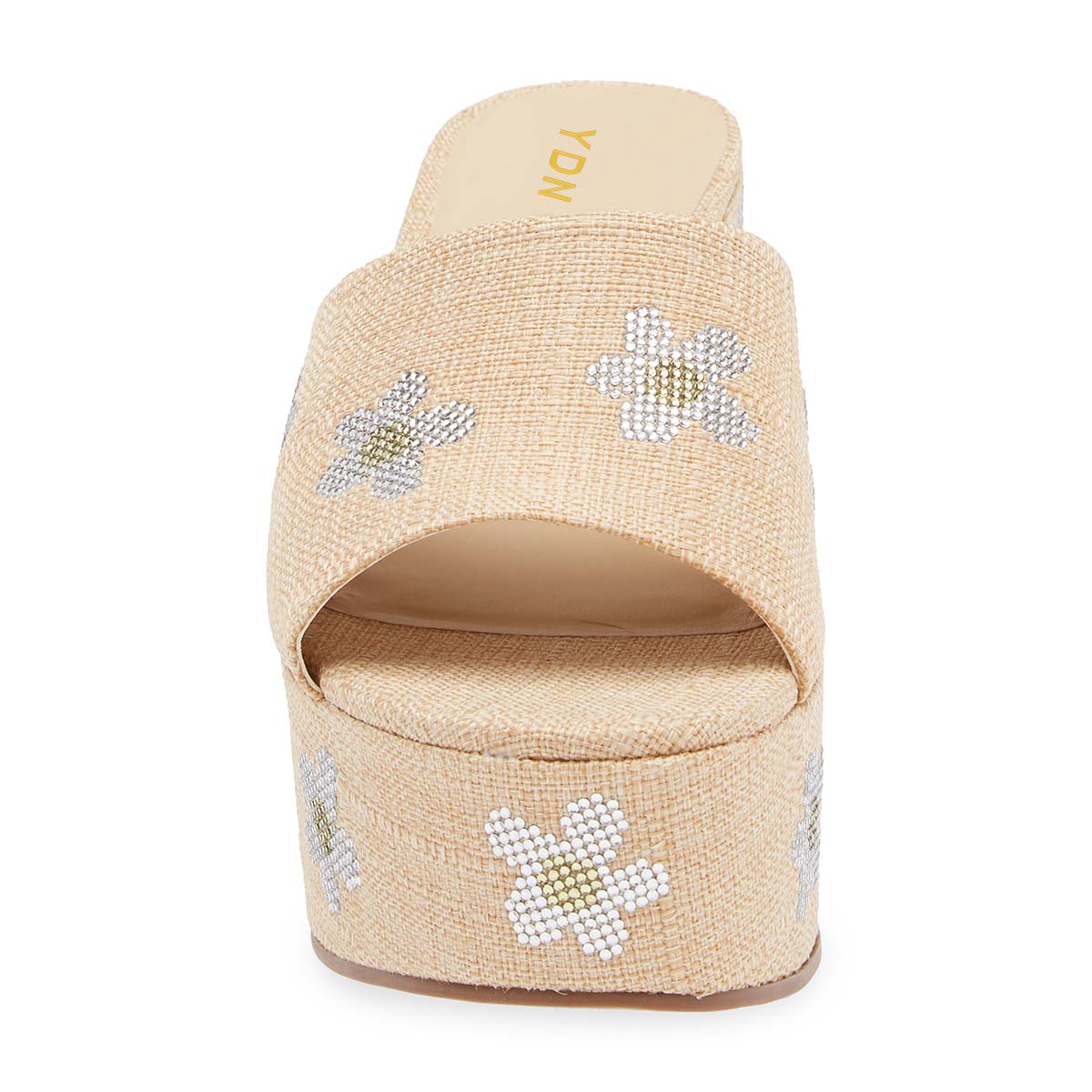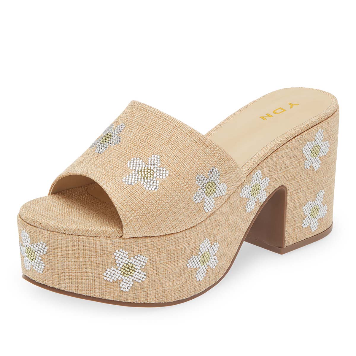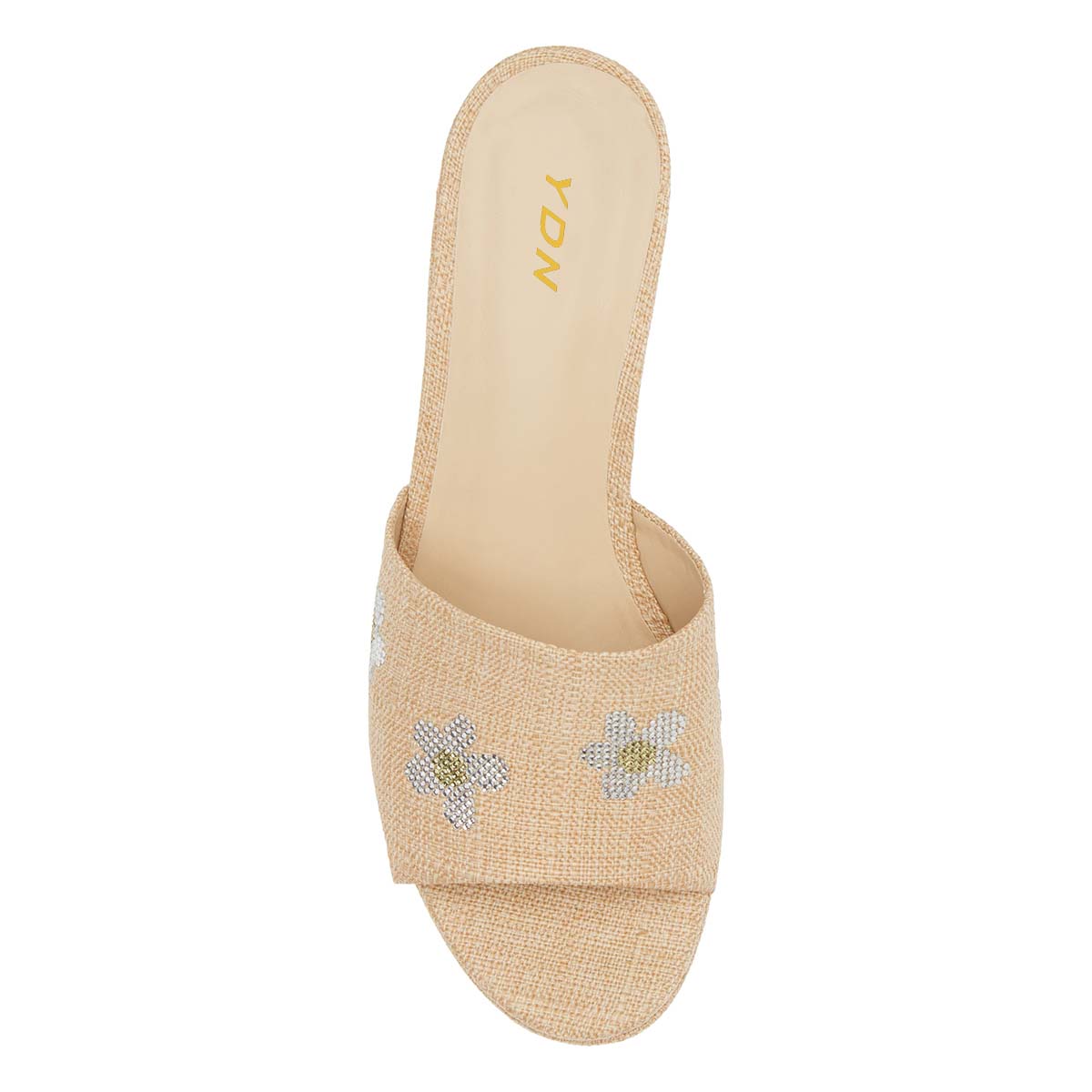 Beige Fabric Open Toe Platform Mules with Studded Flowers