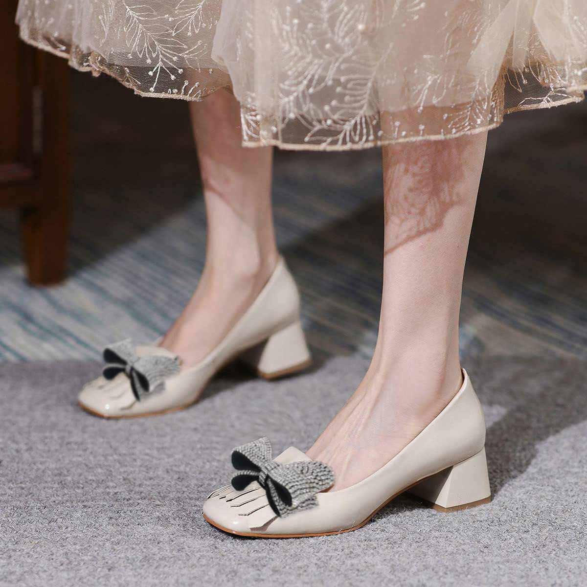 Beige Fringe Chunky Heel Rhinestone Bow Square Toe Pumps for Women