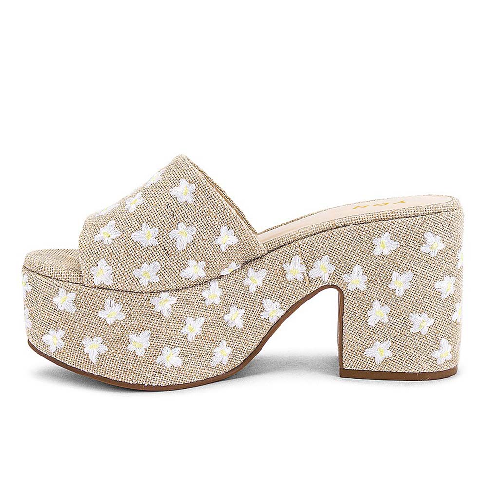 Special Designs: The open-toe platform slide sandals feature chunky heels and delicate flower embroidery.