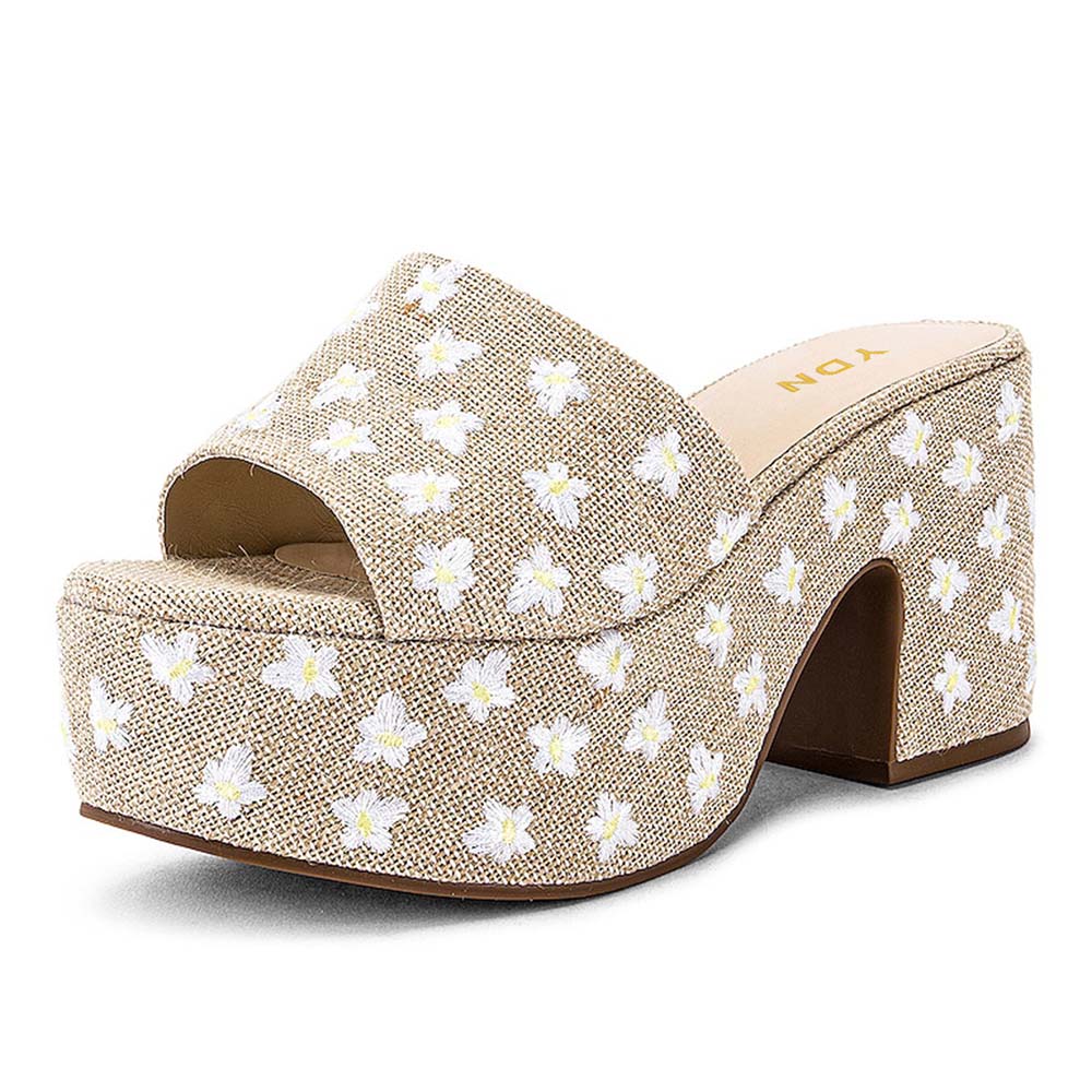 Beige Open Round Toe Flower Embroidery Platform Slide Sandals