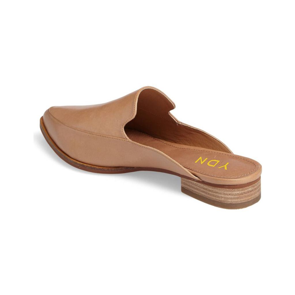 Special Designs: Beige flat mules with patent leather sophistication and slip-on convenience.