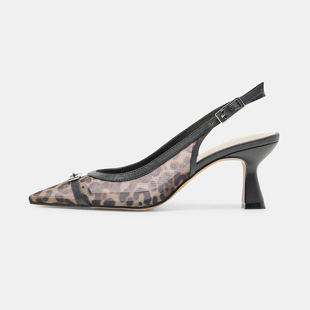 Special Designs: The pumps feature leopard print, a front buckle decor, an adjustable buckle, and a slingback style.