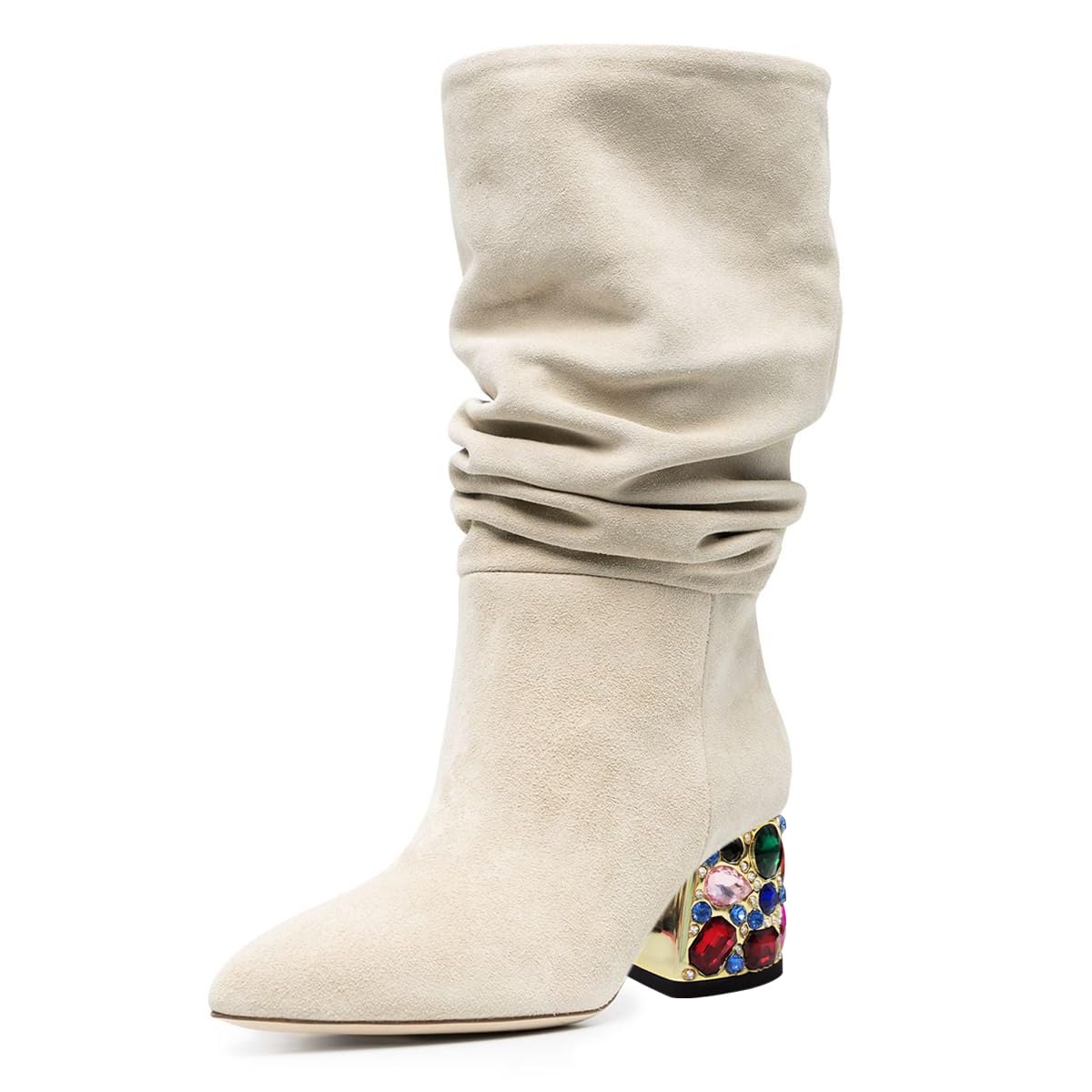 Special Designs: The beige mid-calf boots feature a decorative rhinestone block heel with a pointed toe.