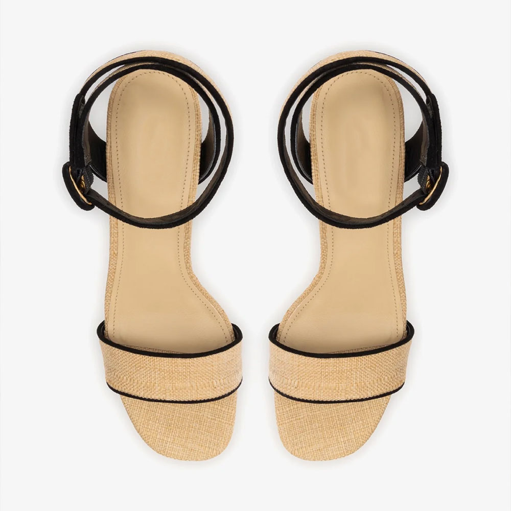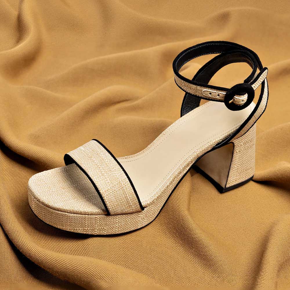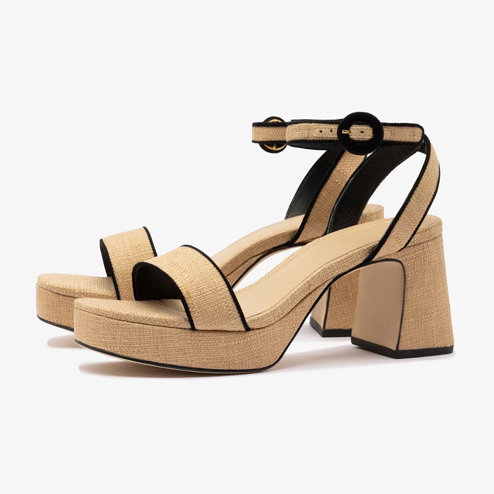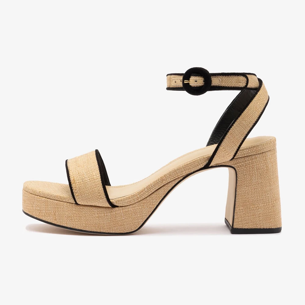 Beige Raffia Ankle Strap Block Heel Platform Sandals with Buckle