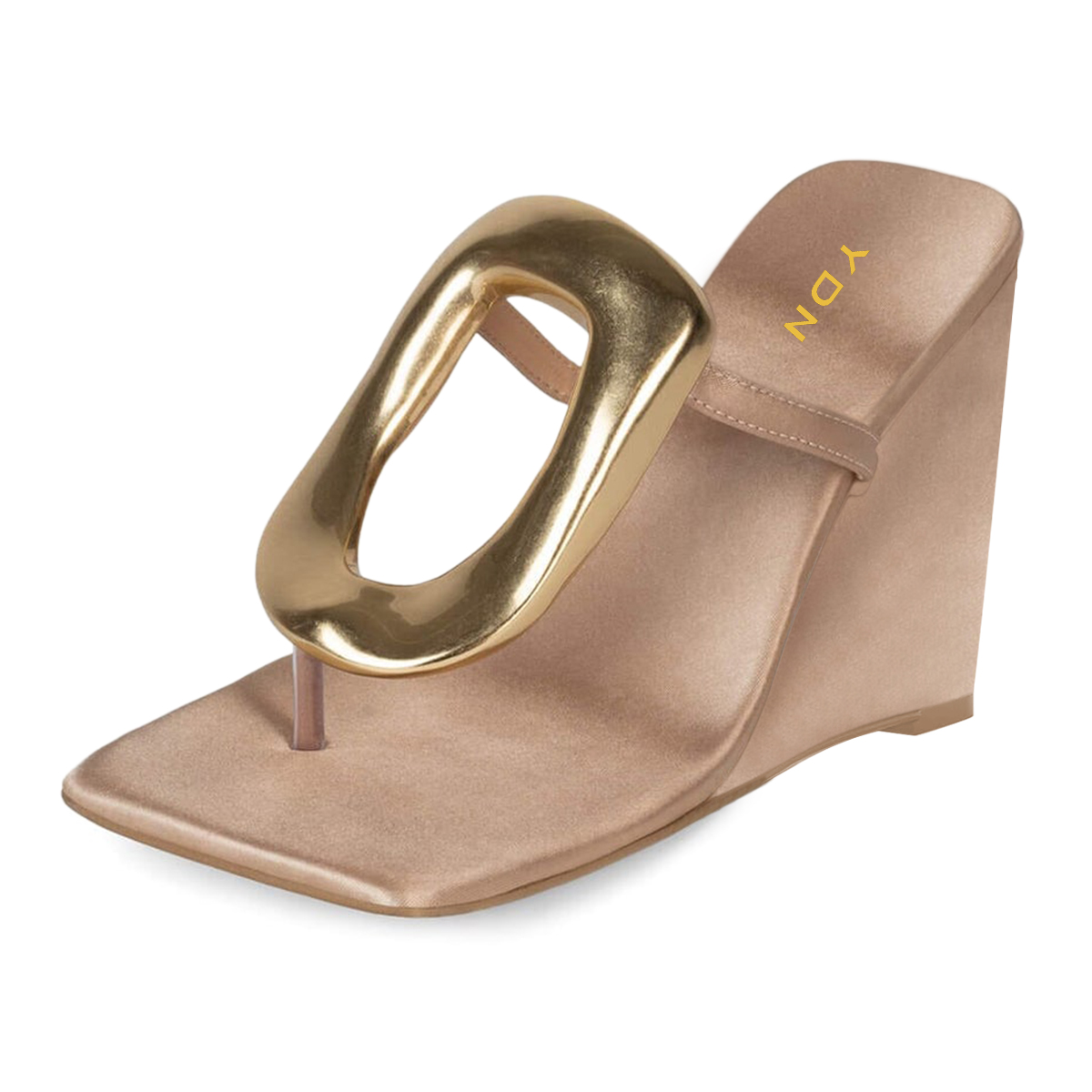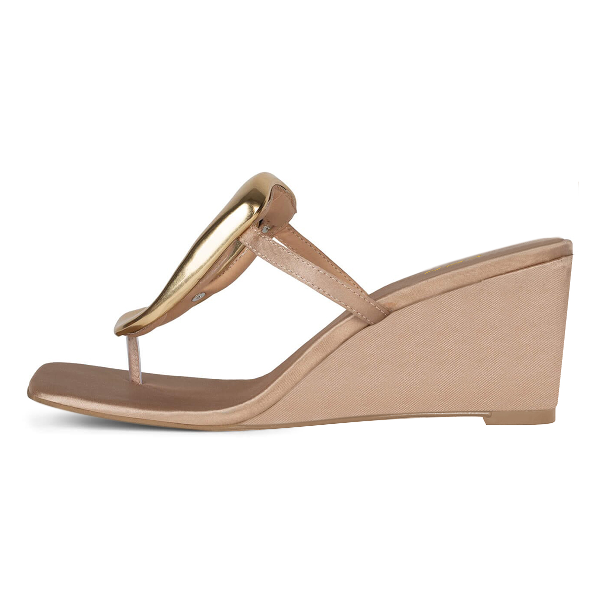 Beige Satin Square Toe Golden Buckle Sandals with Wedge Heels