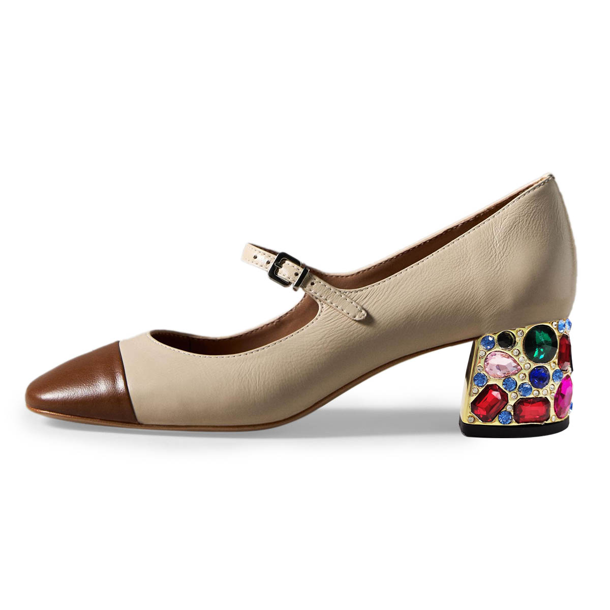 Beige Vegan Leather Brown Square Toe Strap Mary Janes