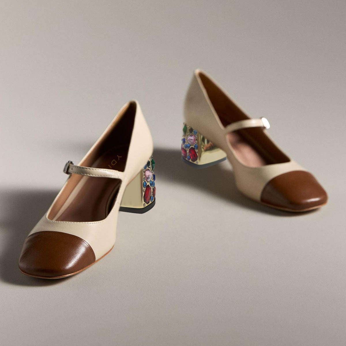 Special Designs: Beige mary janes featuring a brown outline and strap design and a decorative heel.