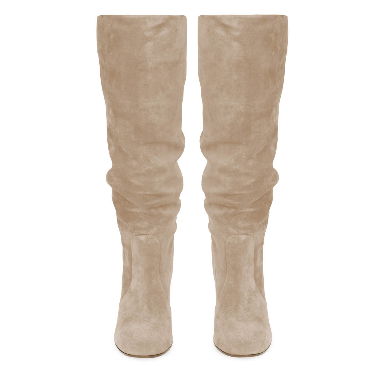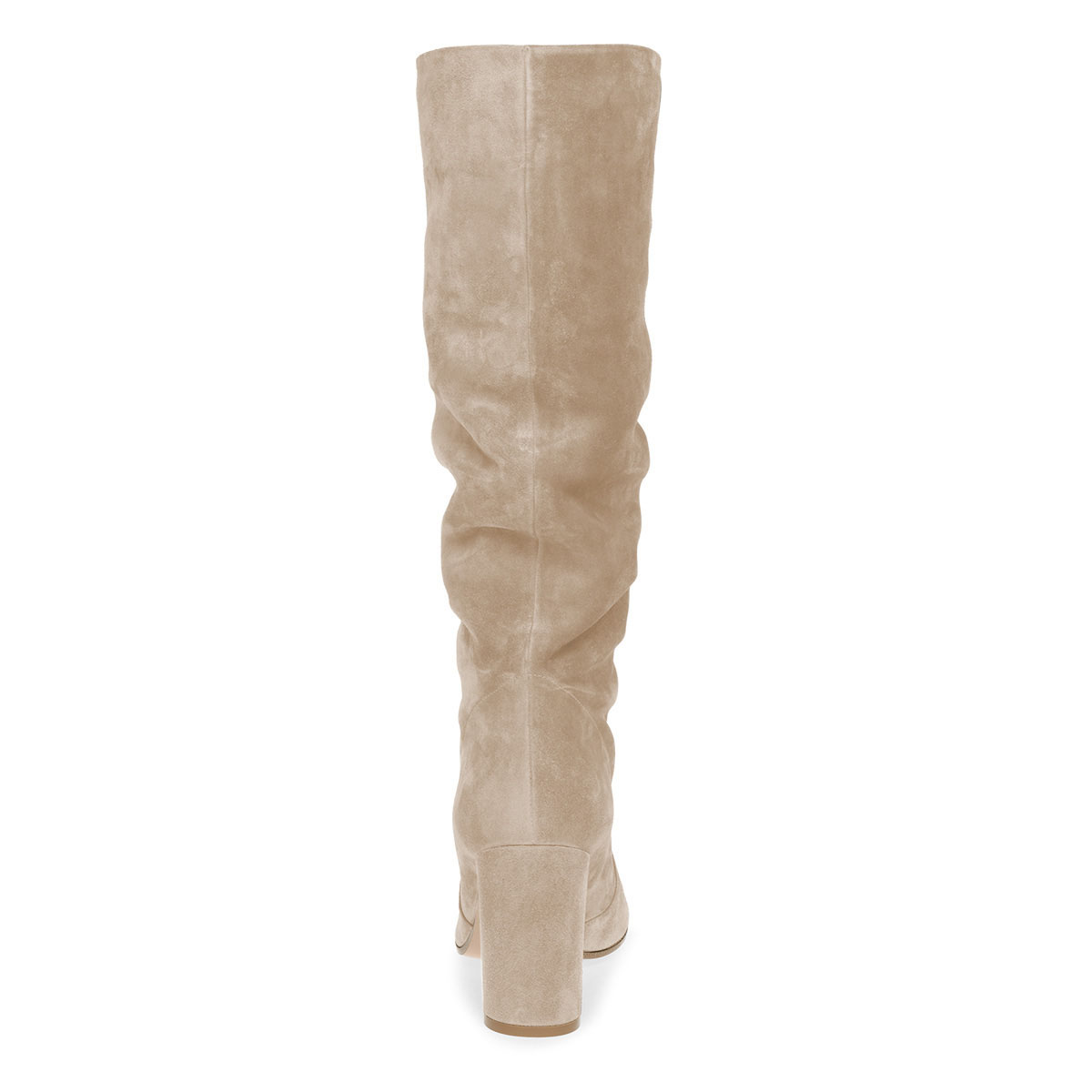 Beige Vegan Suede Chunky Heel Slouch Long Boots with Round Toe