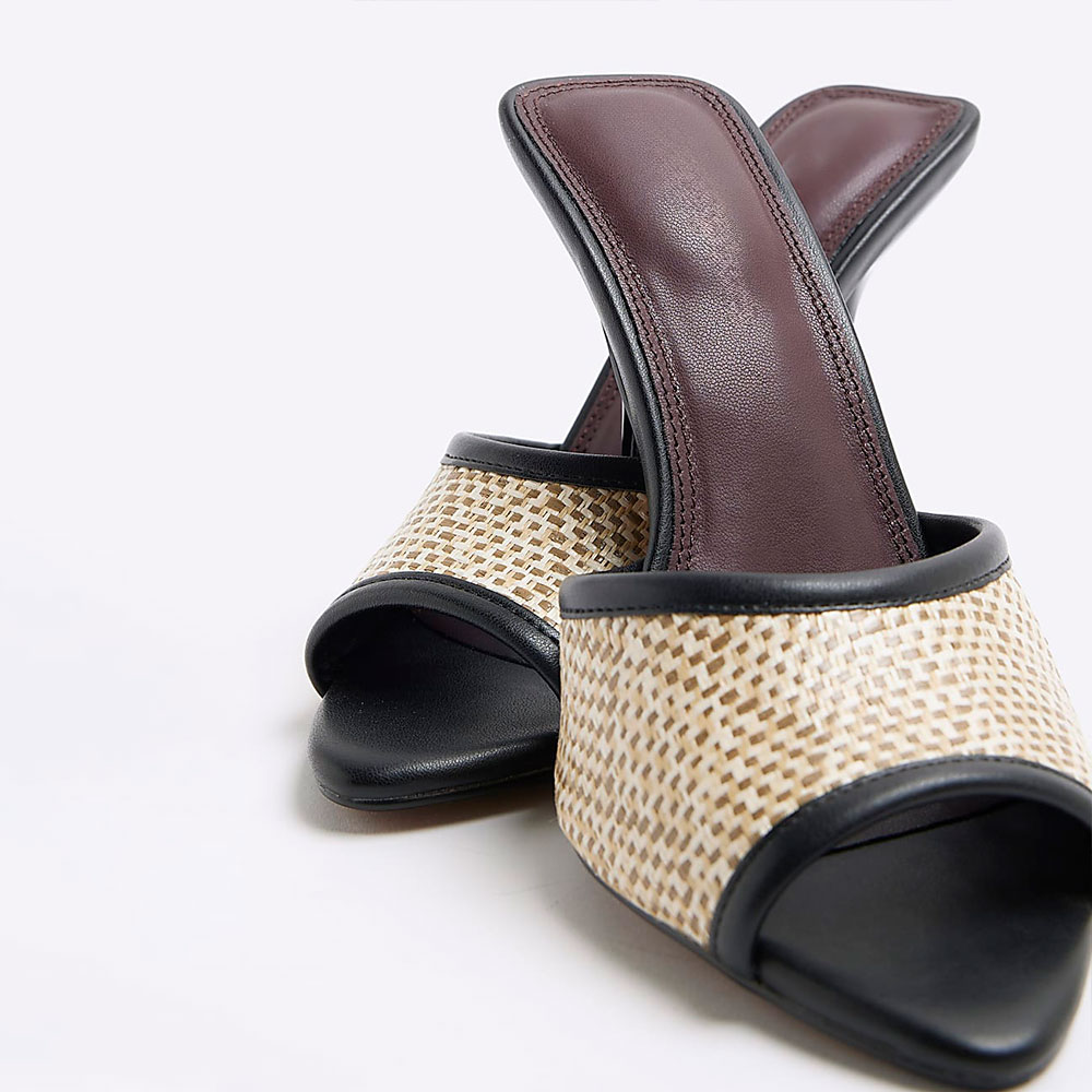 Black & Beige Raffia Peep Toe Stiletto Heel Slide Shoes for Women