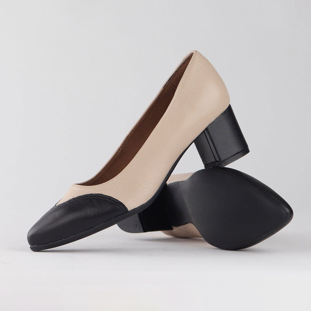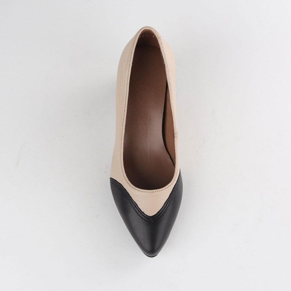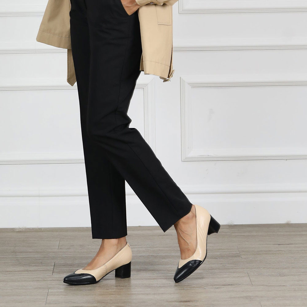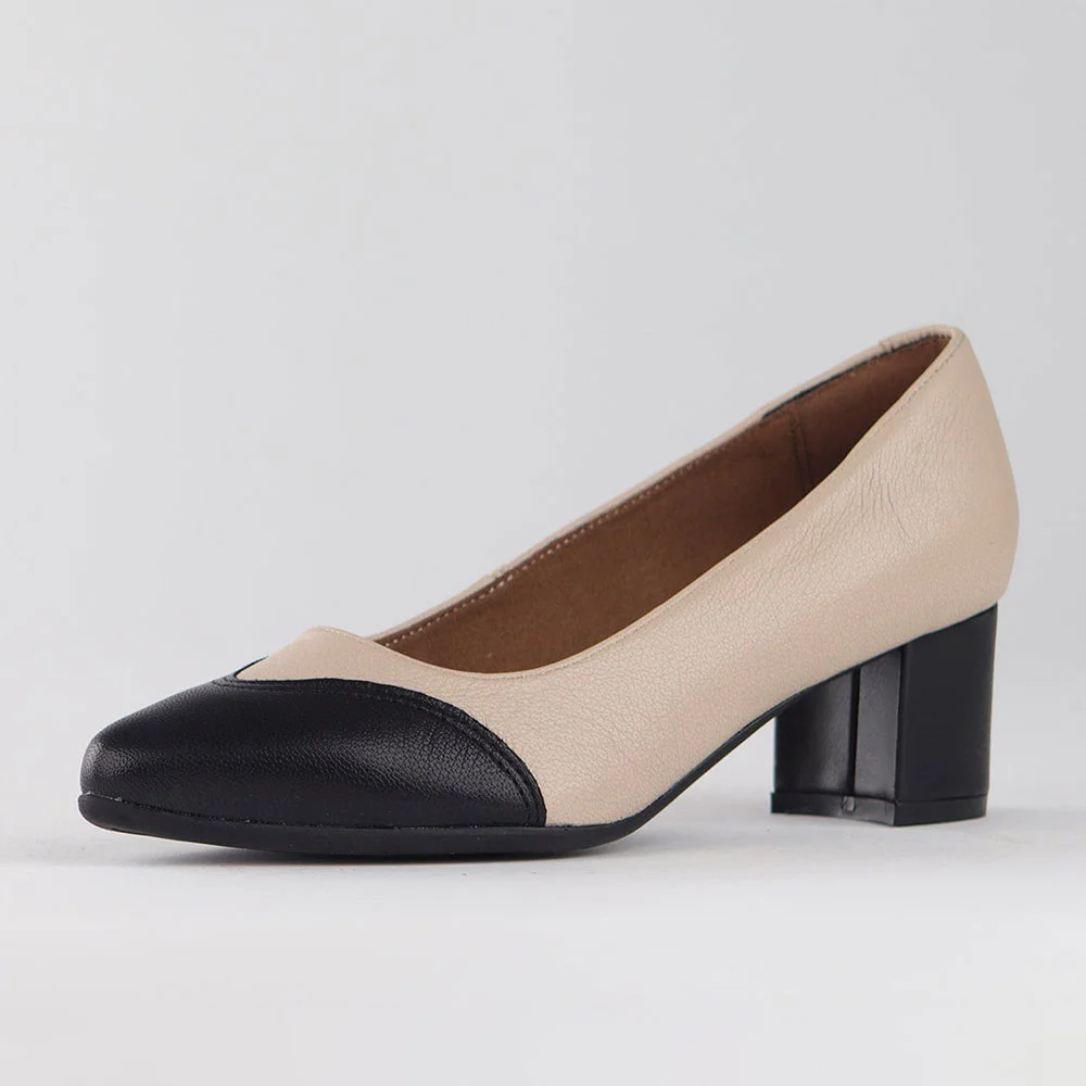 Black & Beige Vegan Leather Pointed Toe Business Block Heel Pumps