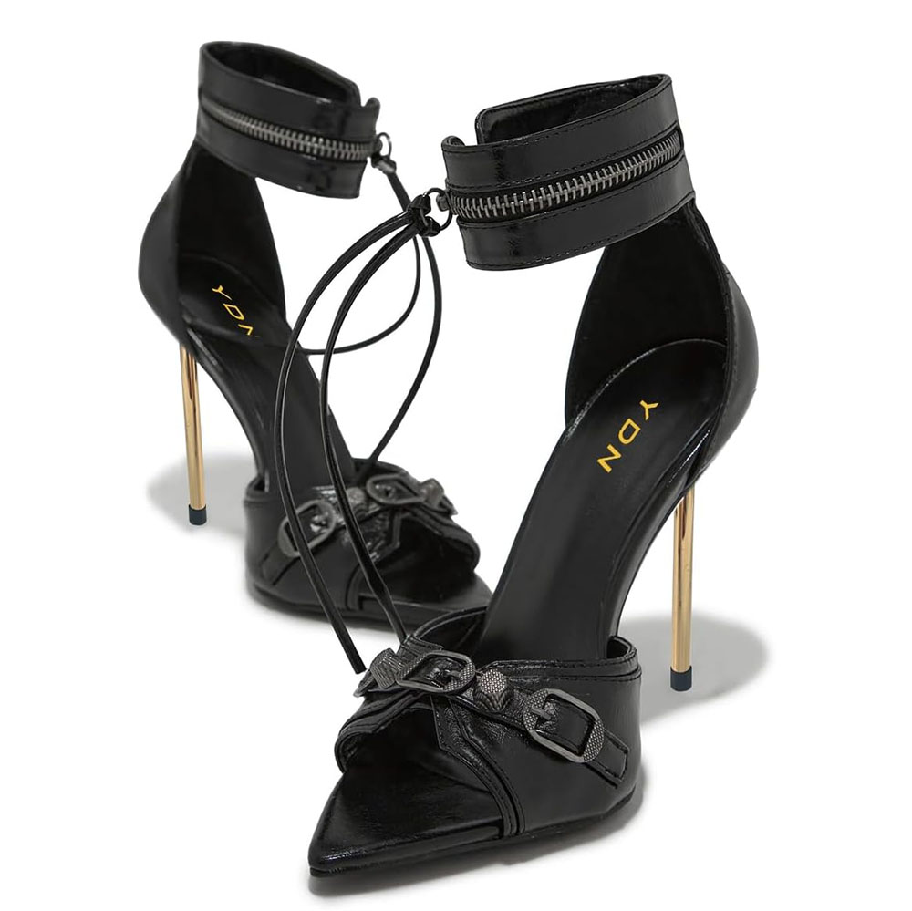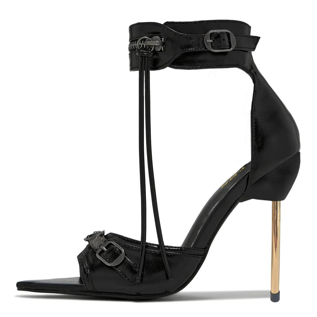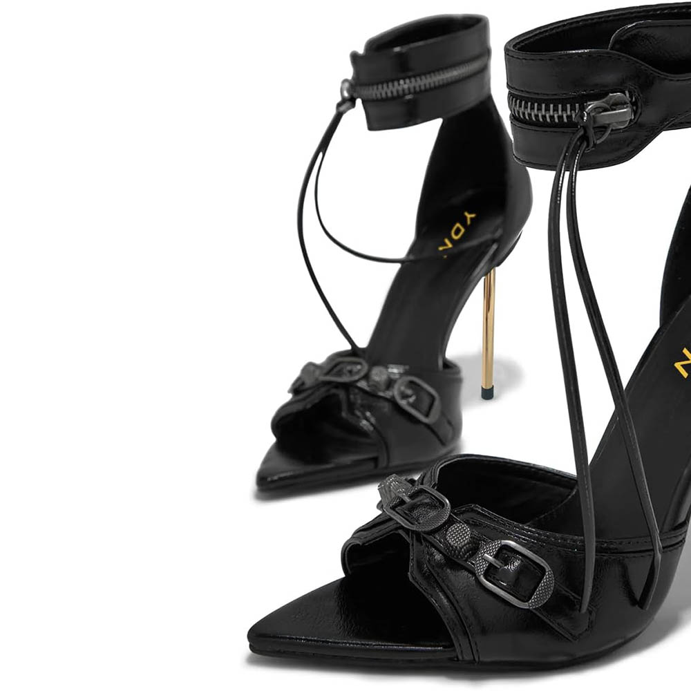 Black Buckle Open-Toe Zipped Ankle Strap Women's Heel Sandals