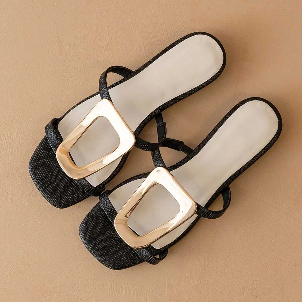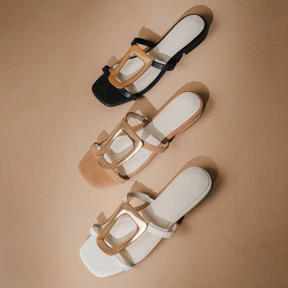 • Special Designs: This stunning mule features a gold buckle and a slip-on style.