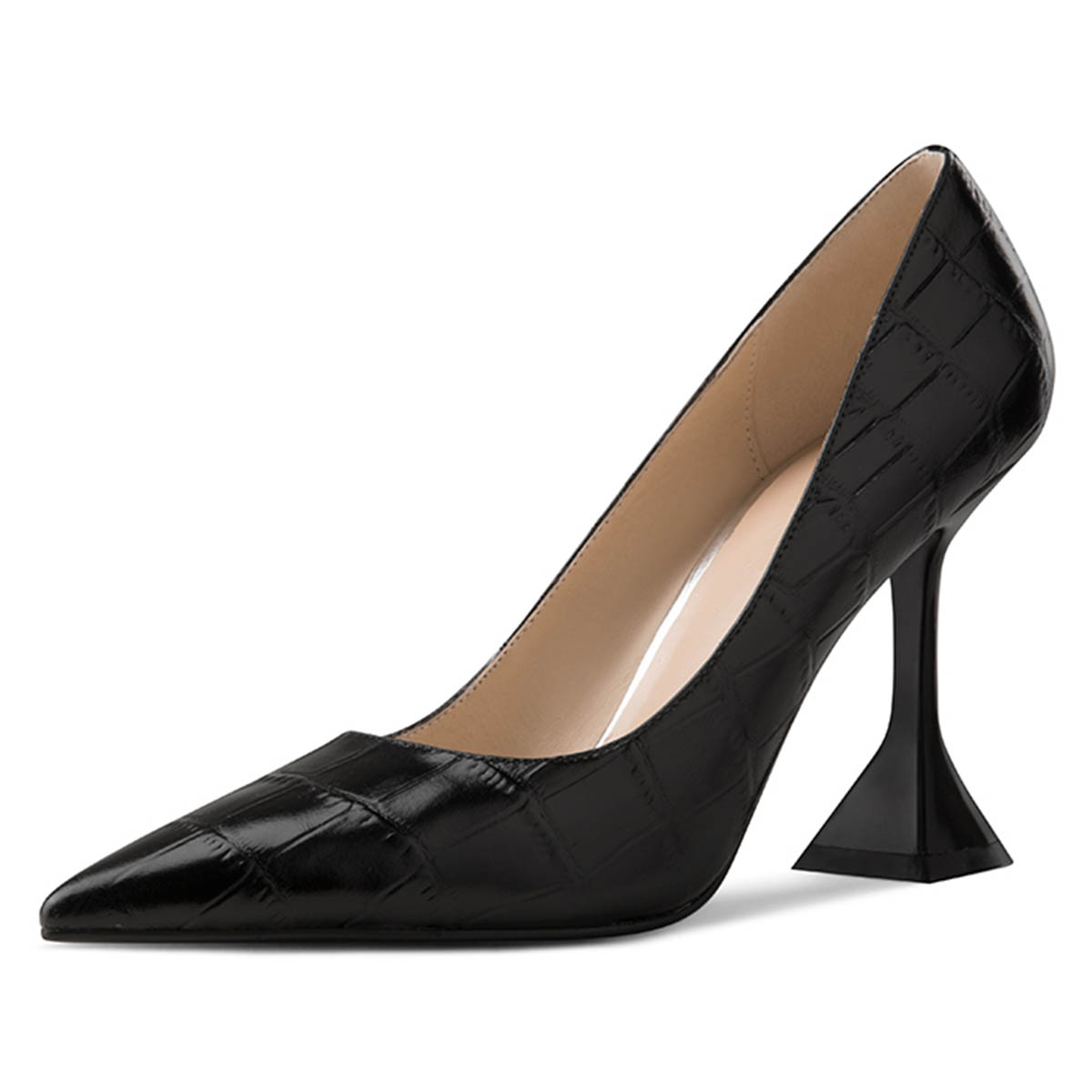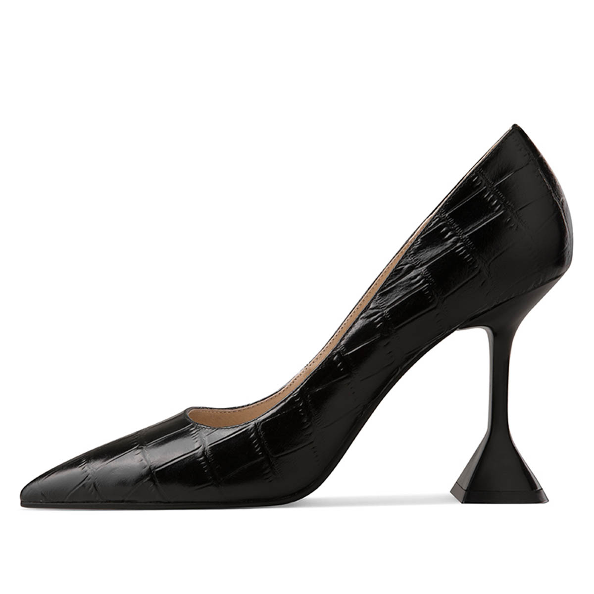 • Special Designs: The black pumps feature a chic crocodile embossed, flared heels and a pointed-toe design.