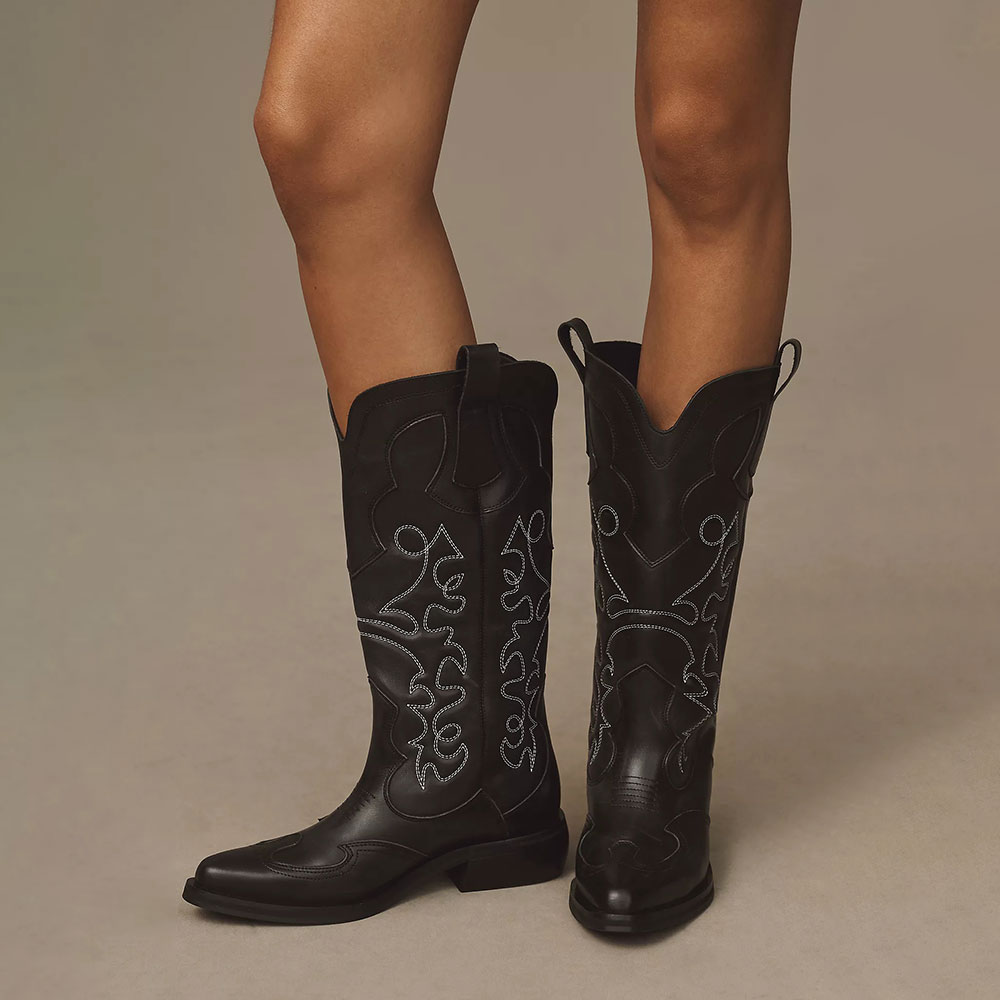 Black Embroidered Snip Toe Mid-Calf Cowgirl Boots with Block Heel