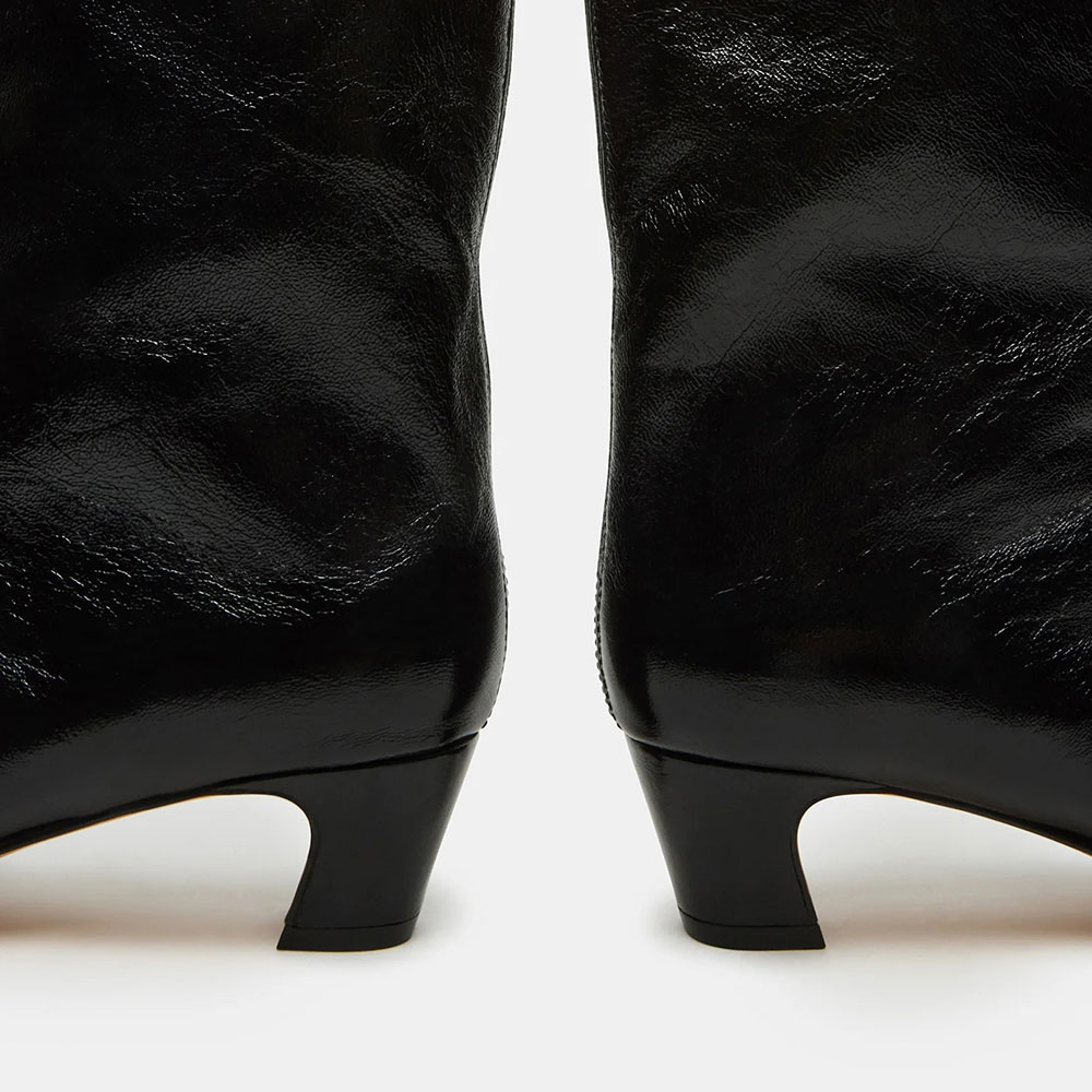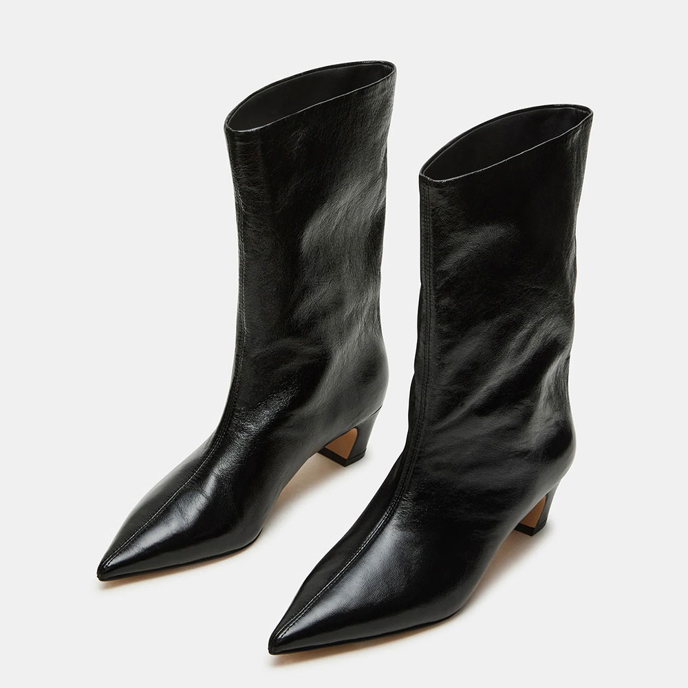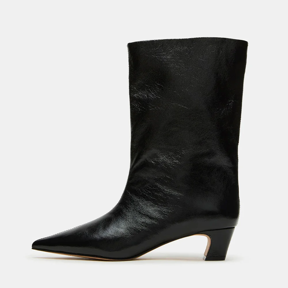 Special Designs: The black mid calf boots feature a pointed toe and chunky heel.