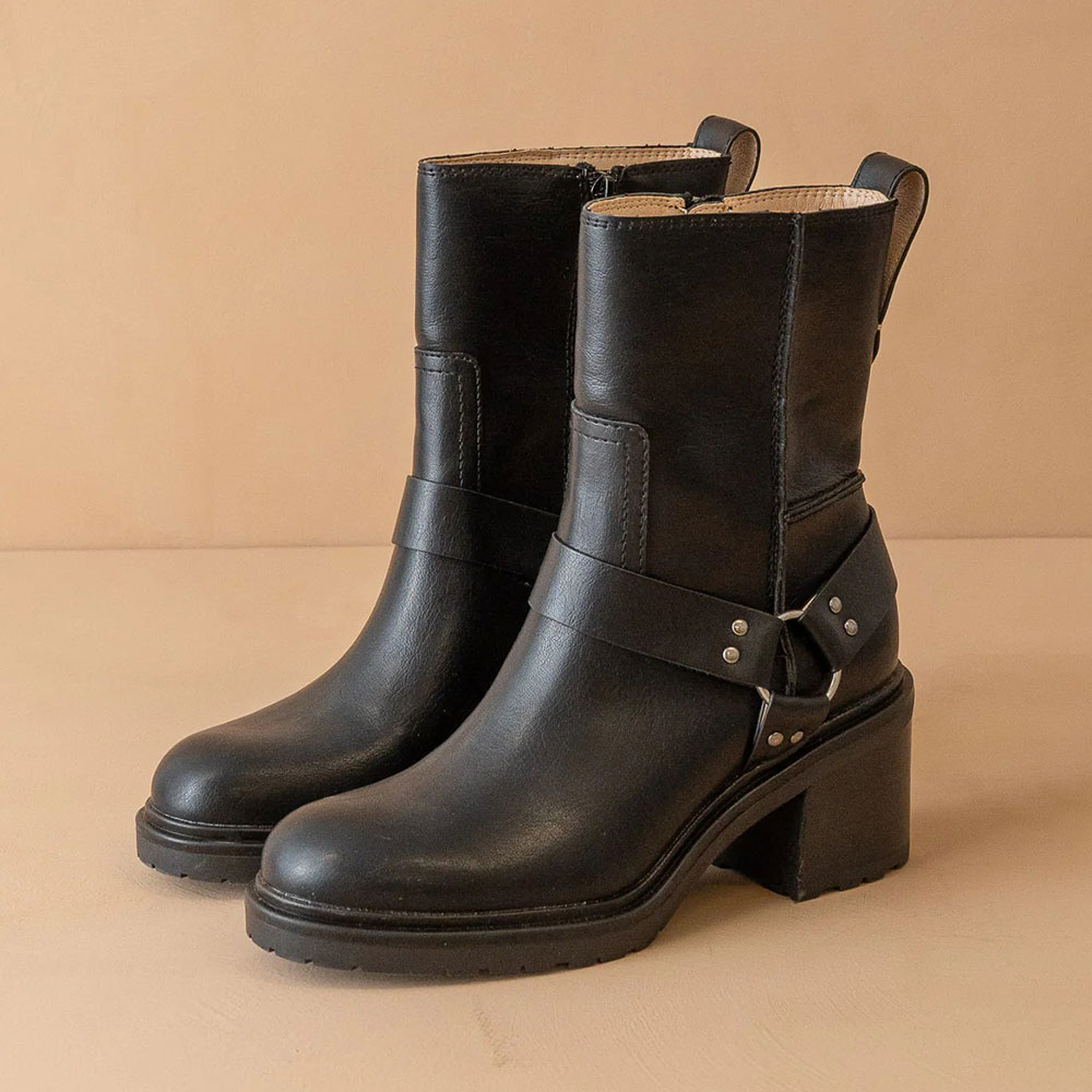Black Faux Leather Round Toe Side Zipper Buckle Chunky Heel Boots