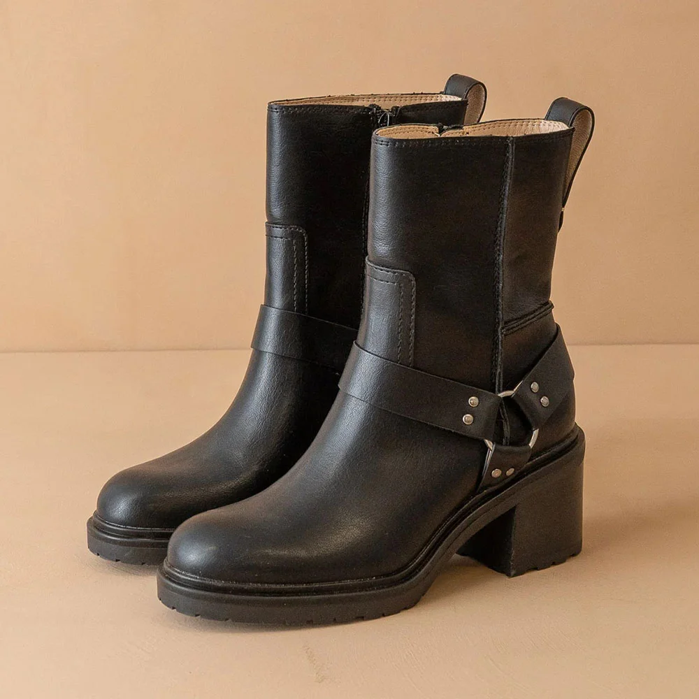 • Special Designs: The boots feature chunky heels, ring hardware with straps, and a side zipper design.