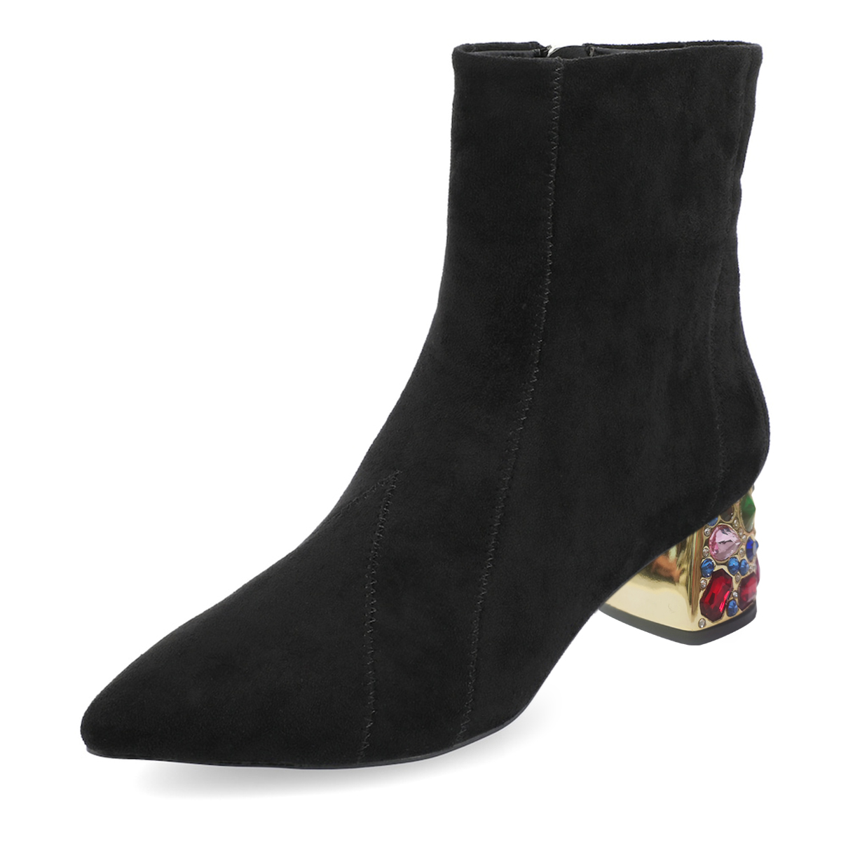 Special Designs: The black ankle boots with faux suede sophistication, side-zip closure and a rhinestone embellished block heel
