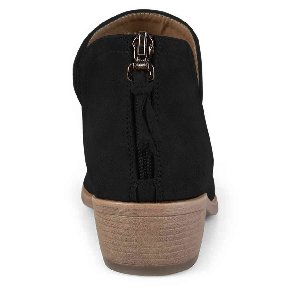 Special Designs: Black booties with classic block heel and back-zip closure.