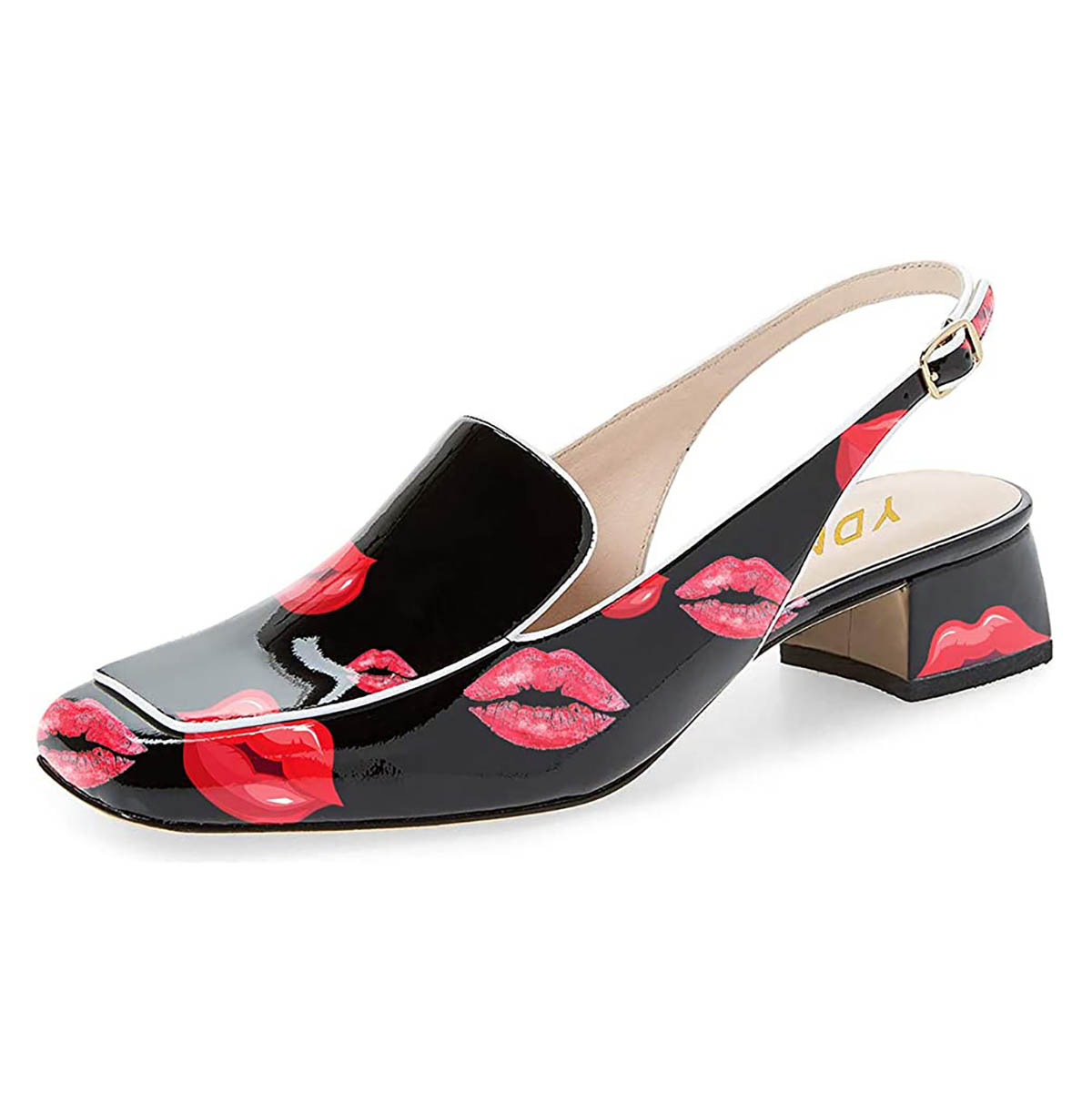 Special Designs: The square-toe slingback heeled loafers feature chunky low heels and a kiss print design.