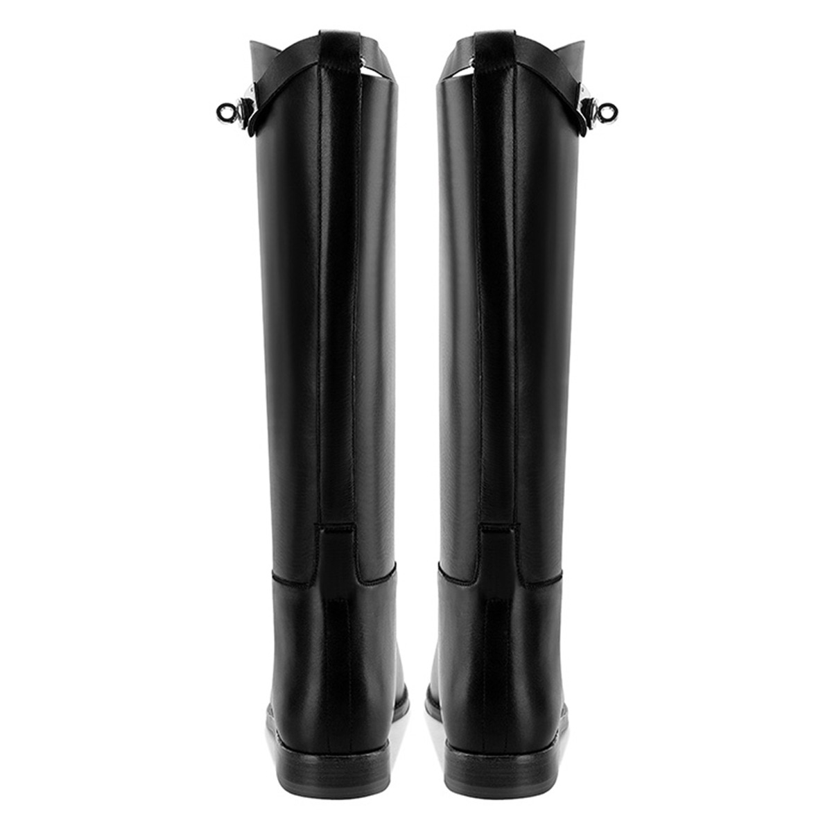 Special Designs: The slip-on boots feature an elegant black color, a round toe, and an adjustable iconic silver buckle design.