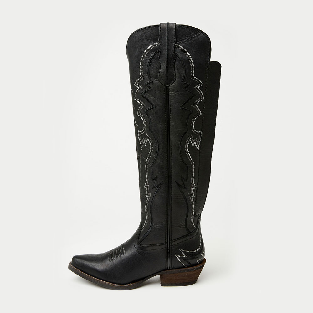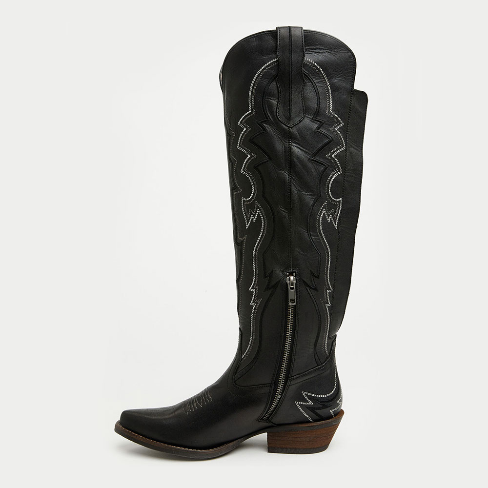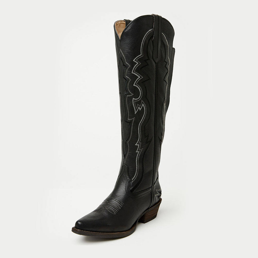 Special Designs: The cowgirl boots feature embroidery, a side zipper, a lace-up, a knee-high length, and a low-heel design.