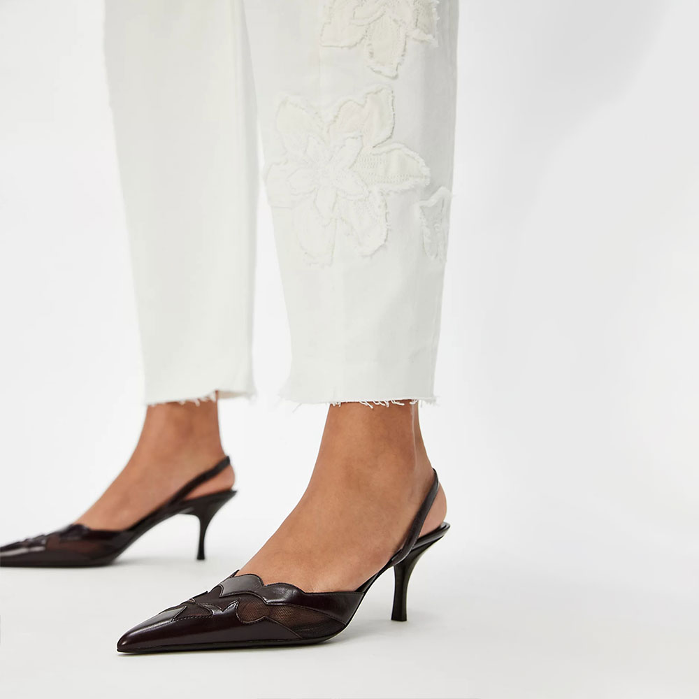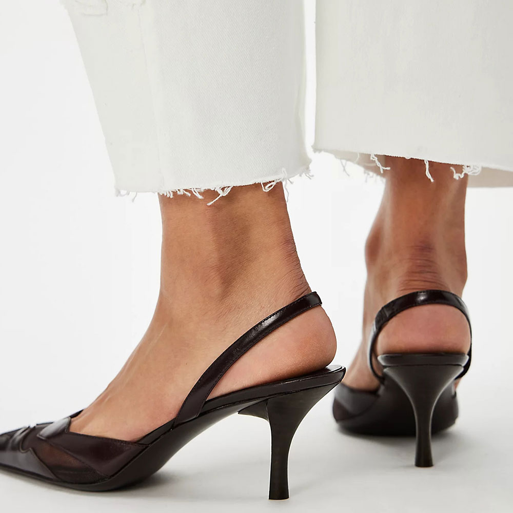 Special Designs: The pointed-toe slingback kitten heel pumps feature mesh and vegan leather patchwork design.