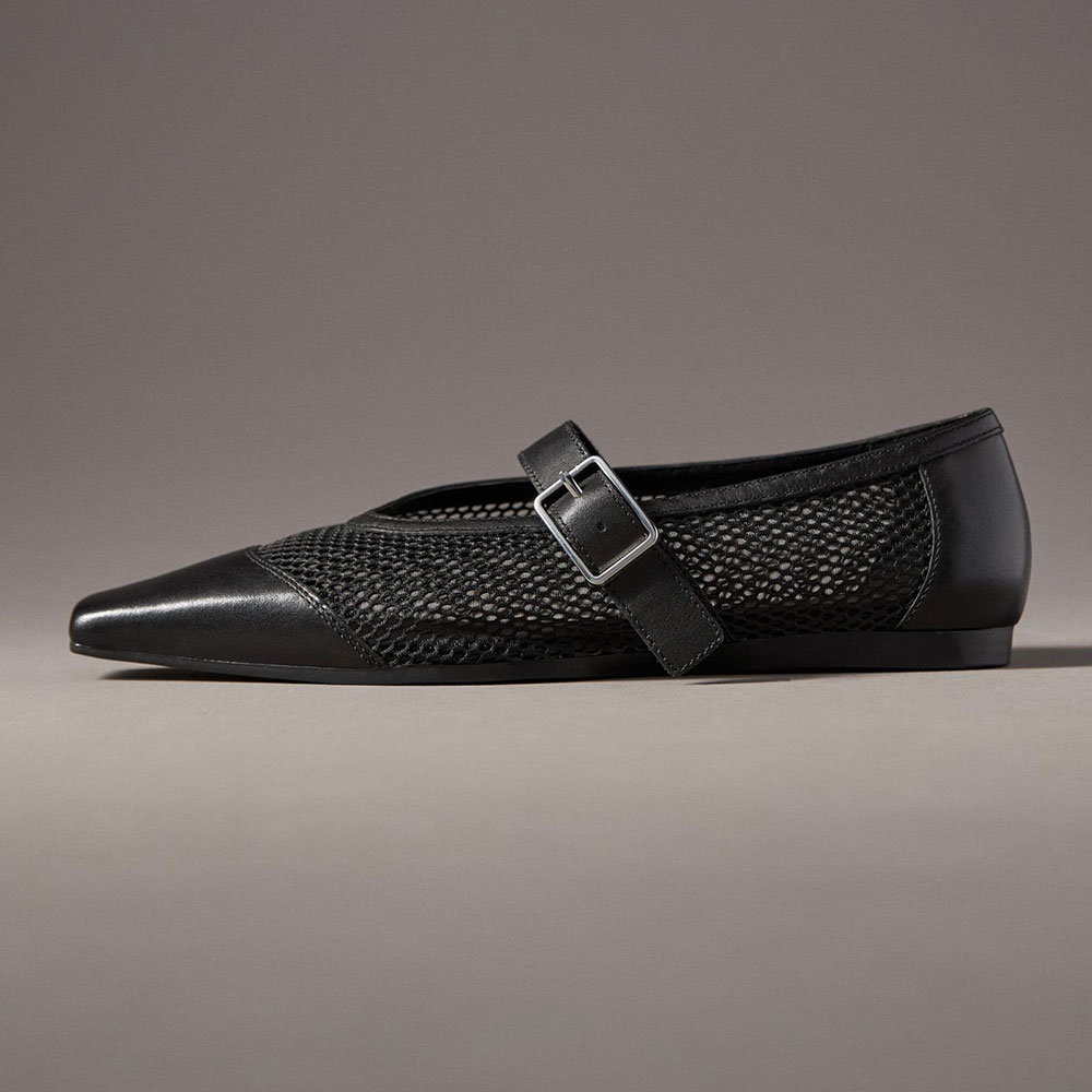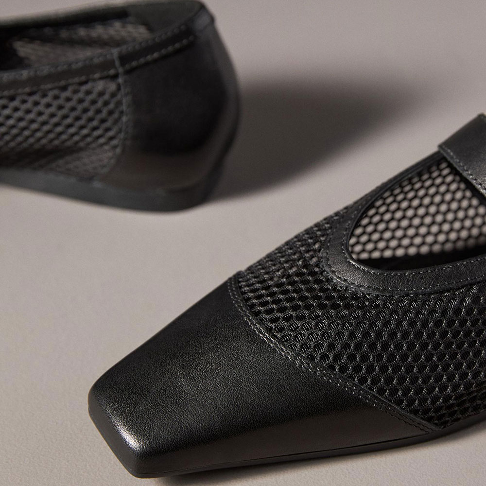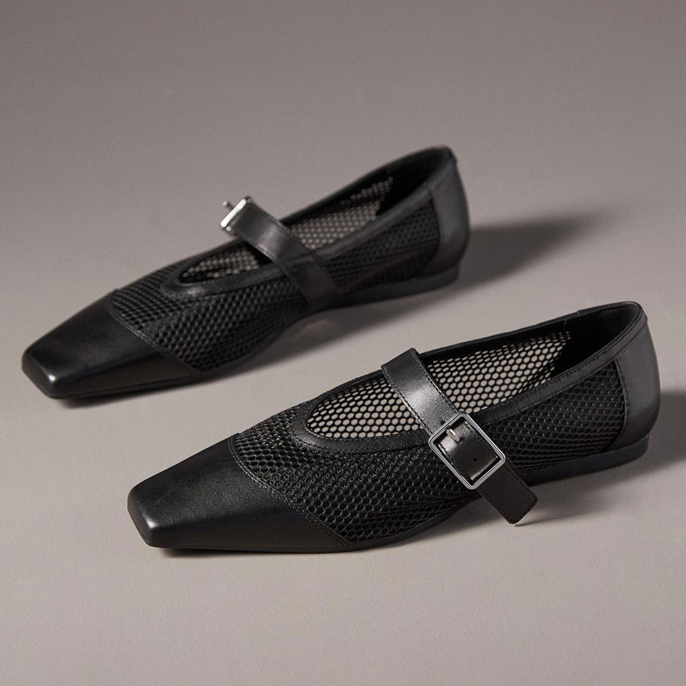 Black Mesh Patchwork Square-Toe Mary Jane Flats with Buckle Strap