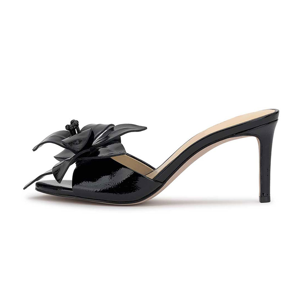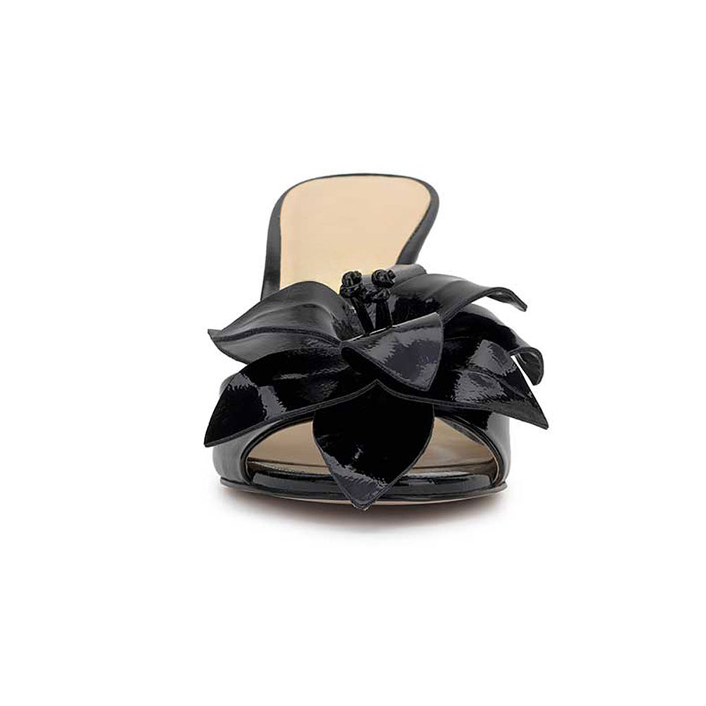 Black Patent Leather Flower Decor Open Toe Stiletto Heel Slide Sandals