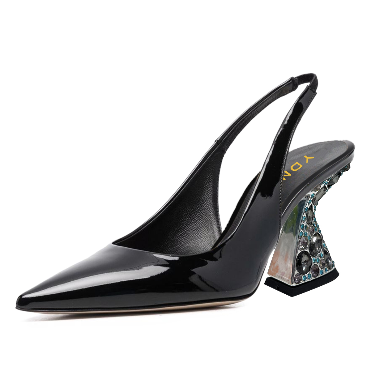 Black Patent Leather Pointed Slingback Pumps with Decorative Heels