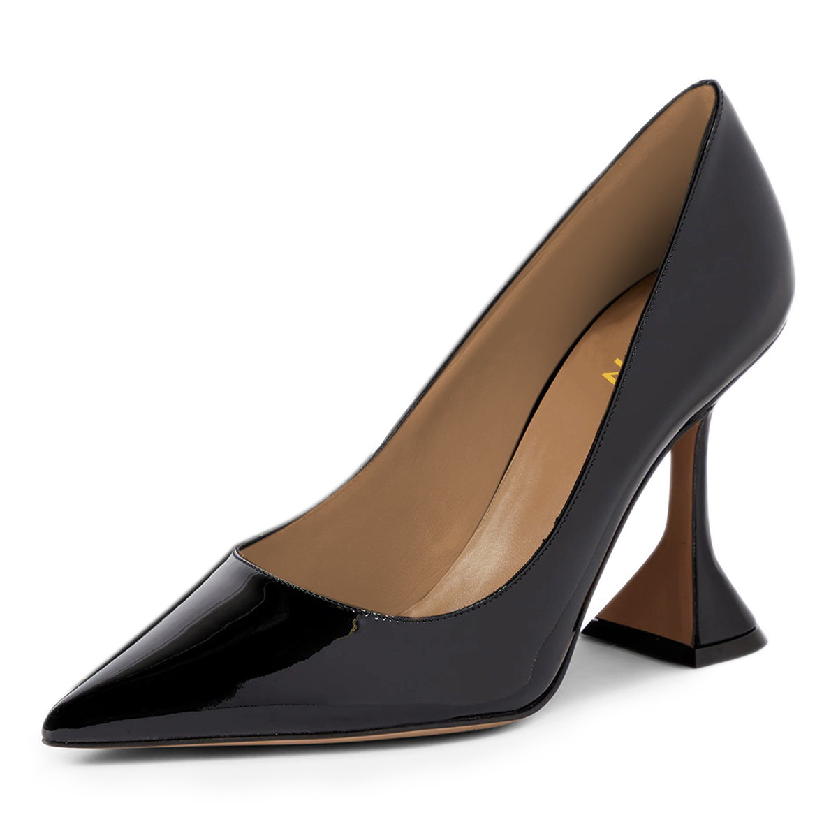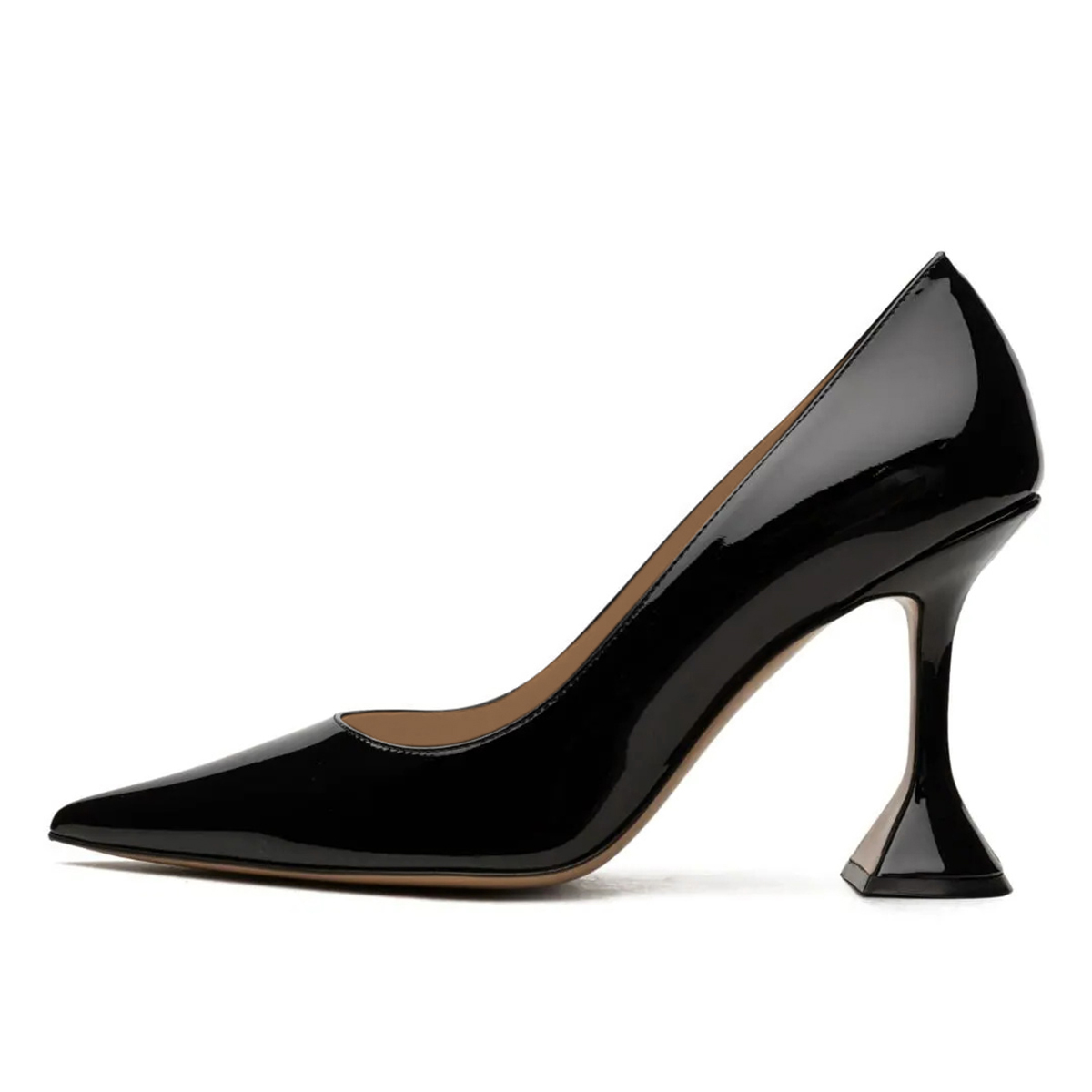 Black Patent Leather Pointed Toe Elegant Pumps with Flared Heels