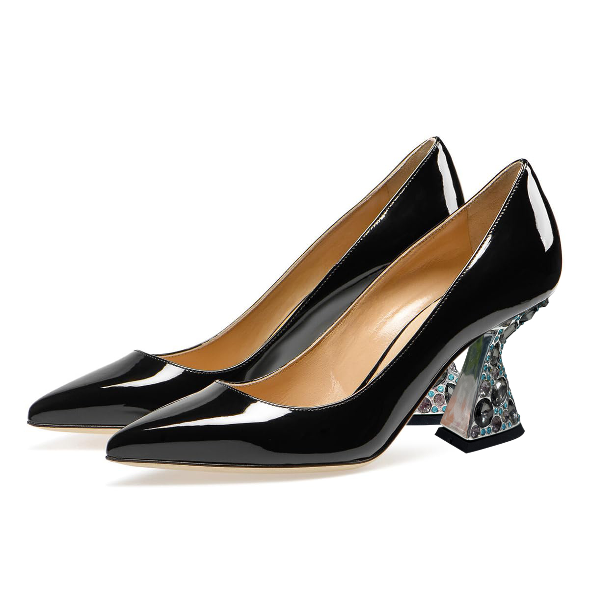 Black Patent Leather Pointed Toe Rhinestone Flared Heel Pumps Shoes