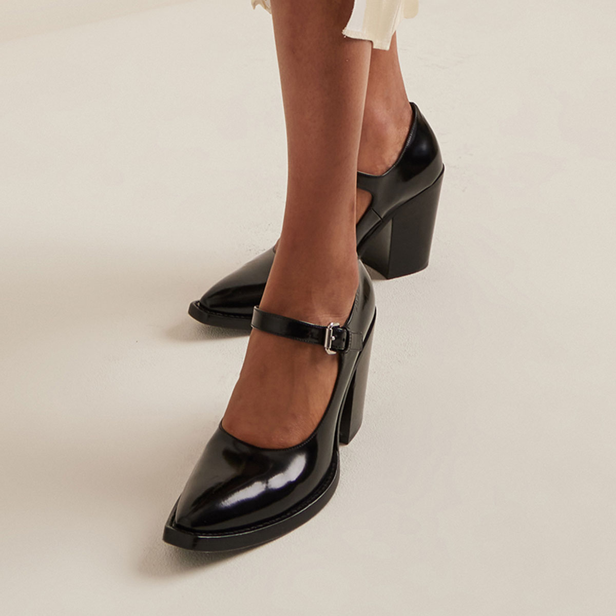Special Designs: Black mary janes featuring a buckle fastening strap pattern and a classic block heel